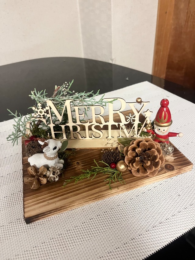 シックな色の板にクリスマスツリーを。 フレッシュ(生の葉)とプリザーブド、造花などを組み合わせてます。 一つ一つ雰囲気が違います。 台付きです。