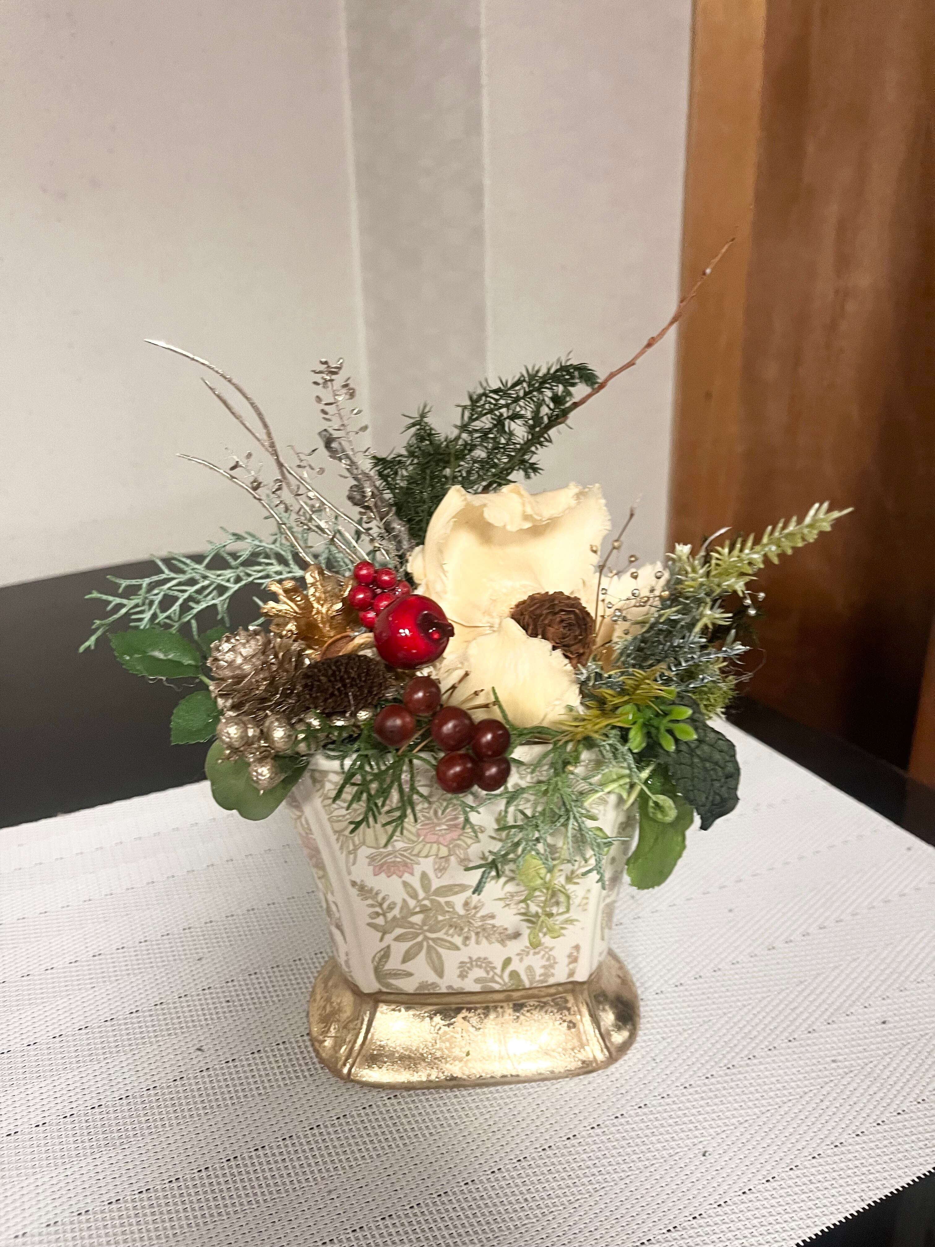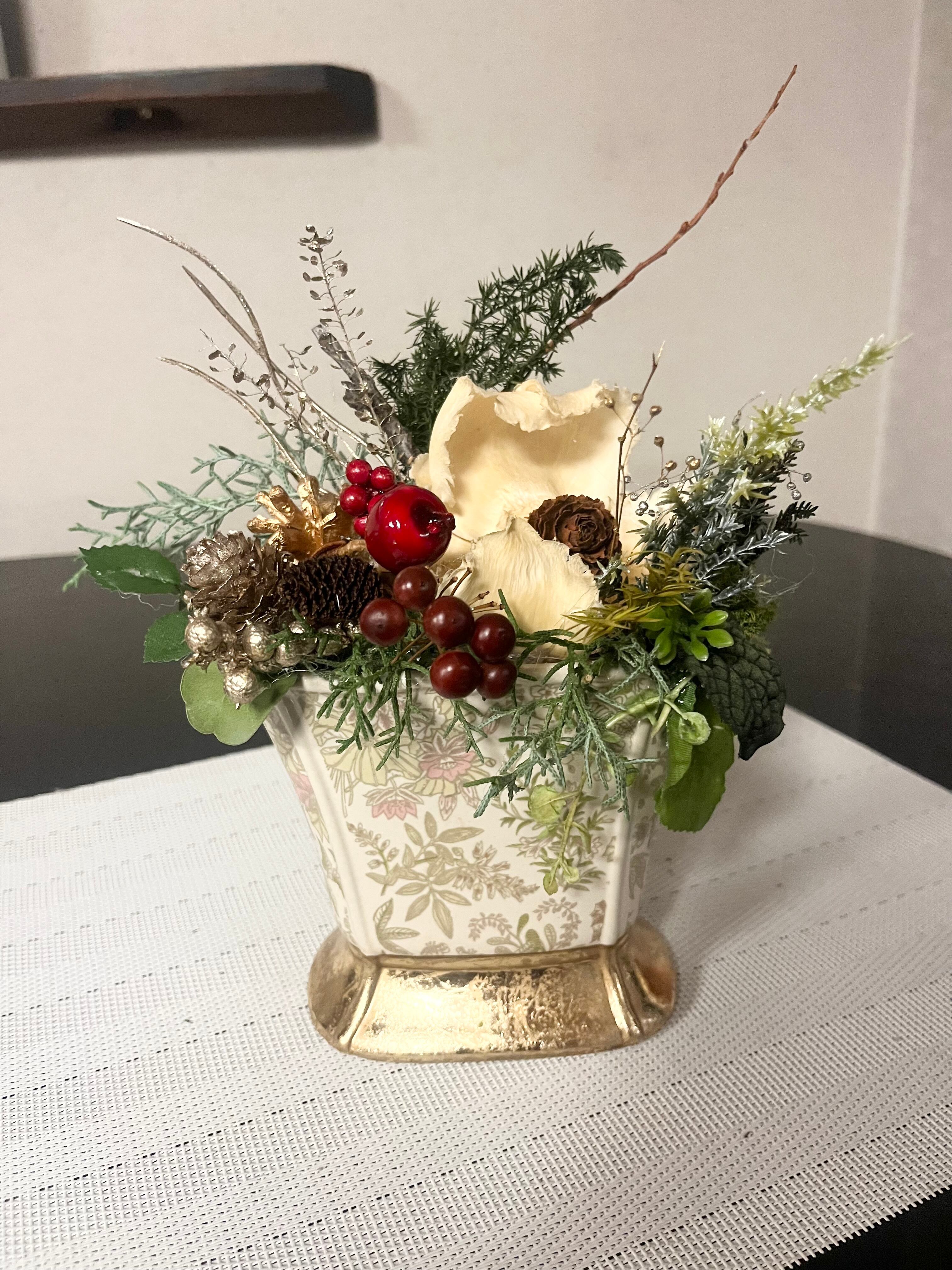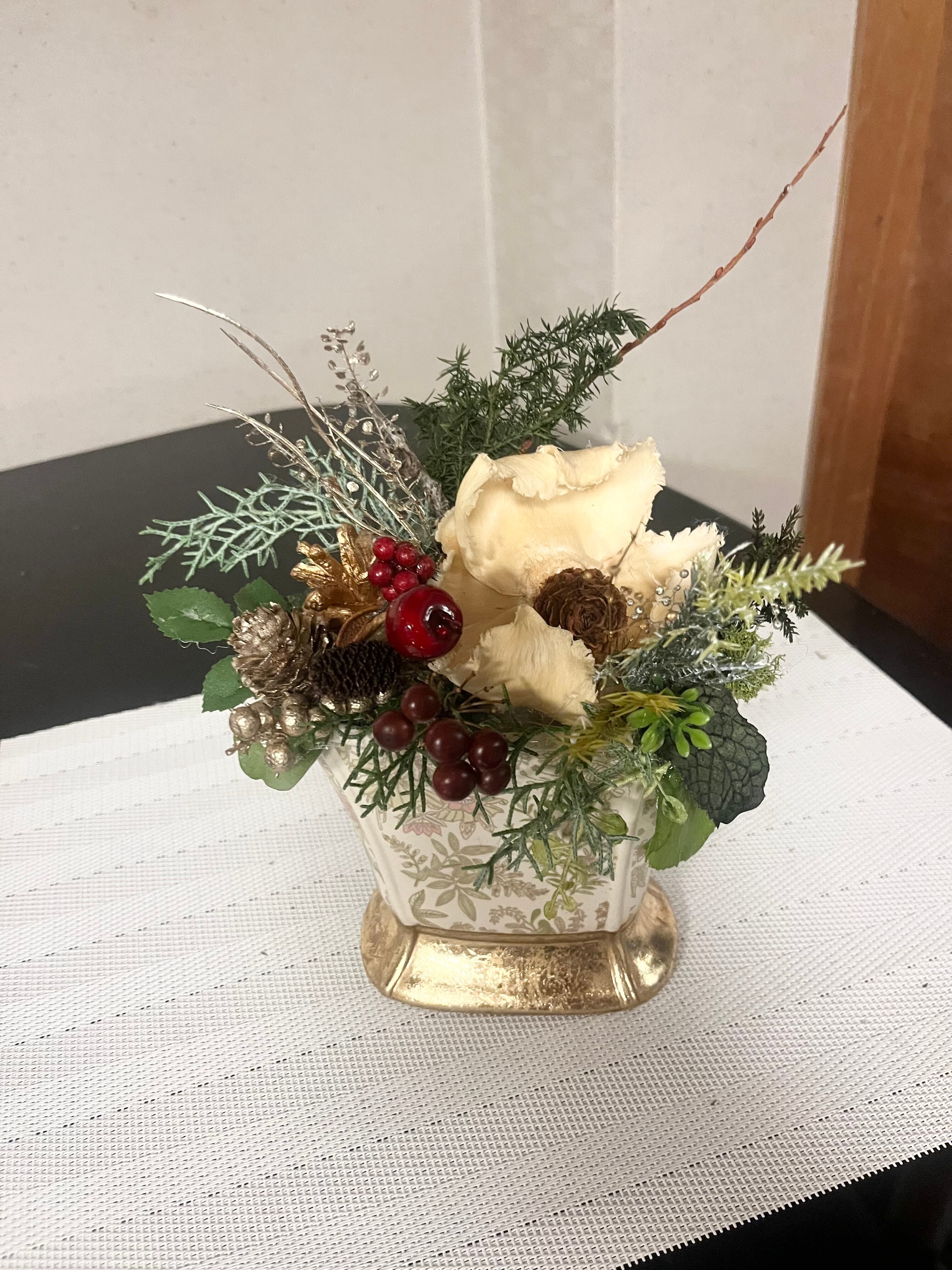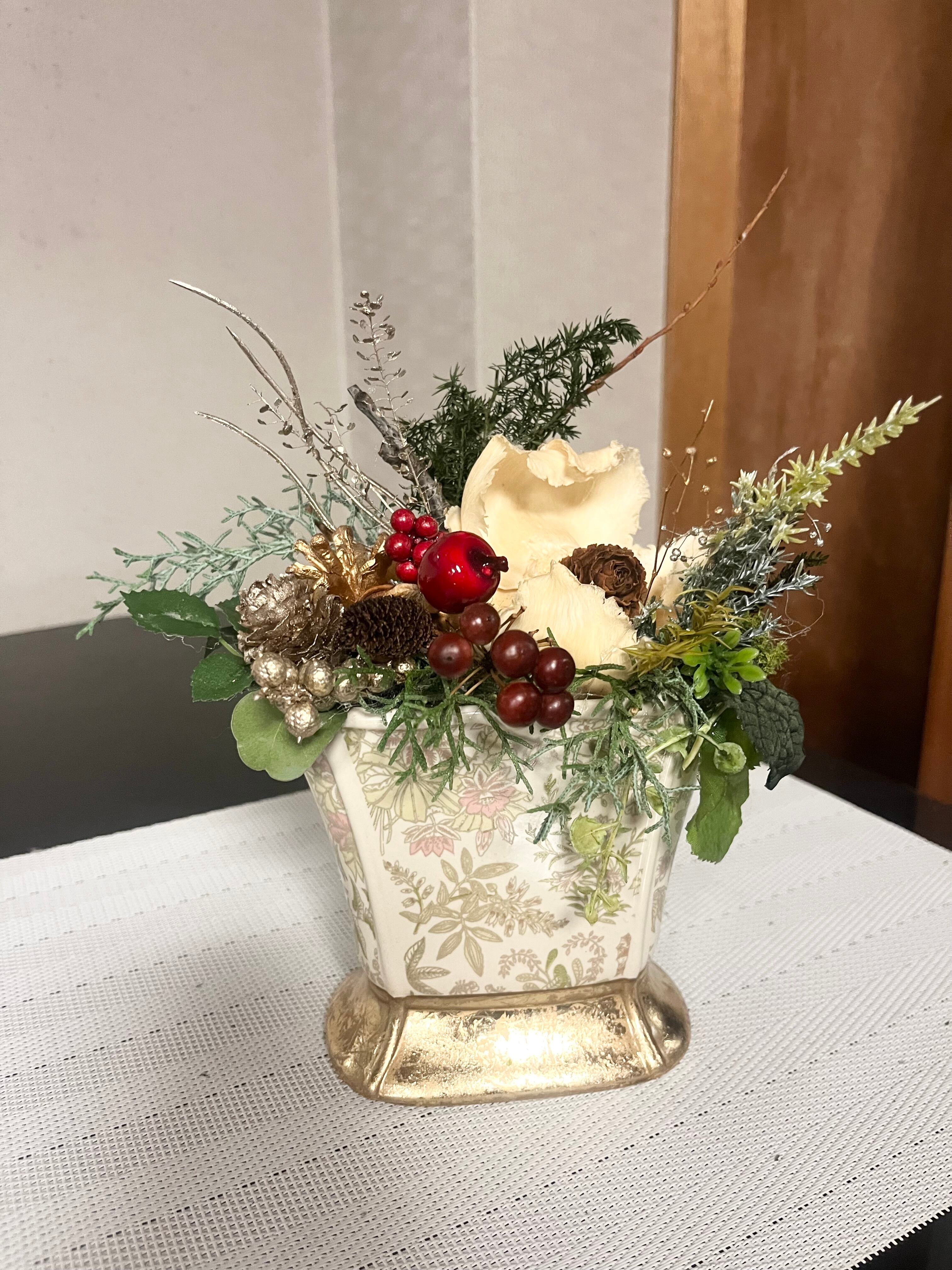 ちょっと華やかな器にクリスマスのアレンジをしてみました。