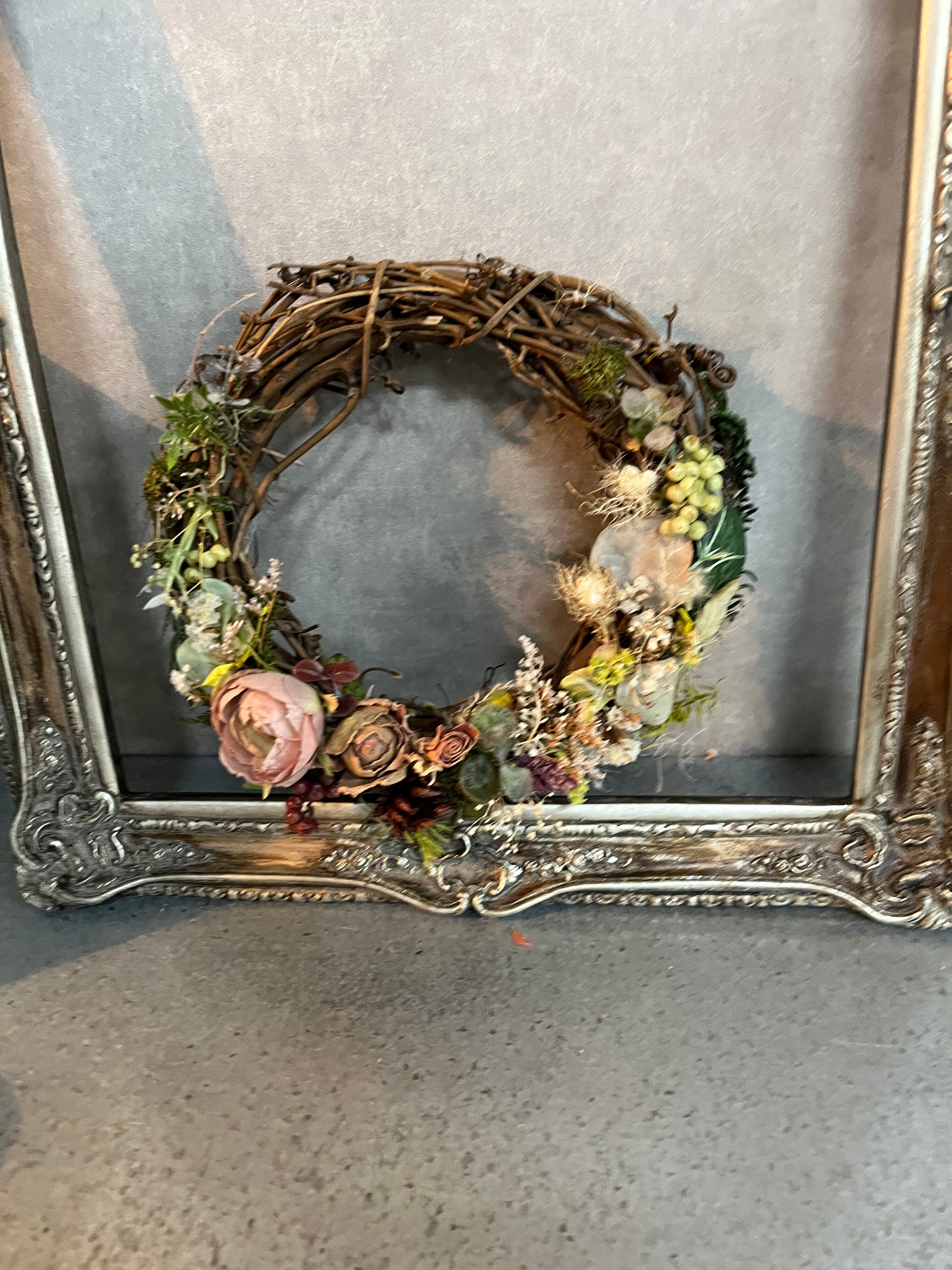 ドライフラワー&造花のバラを使って、繊細な雰囲気で作成しました。ドライフラワーと造花のミックスです。