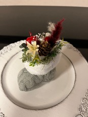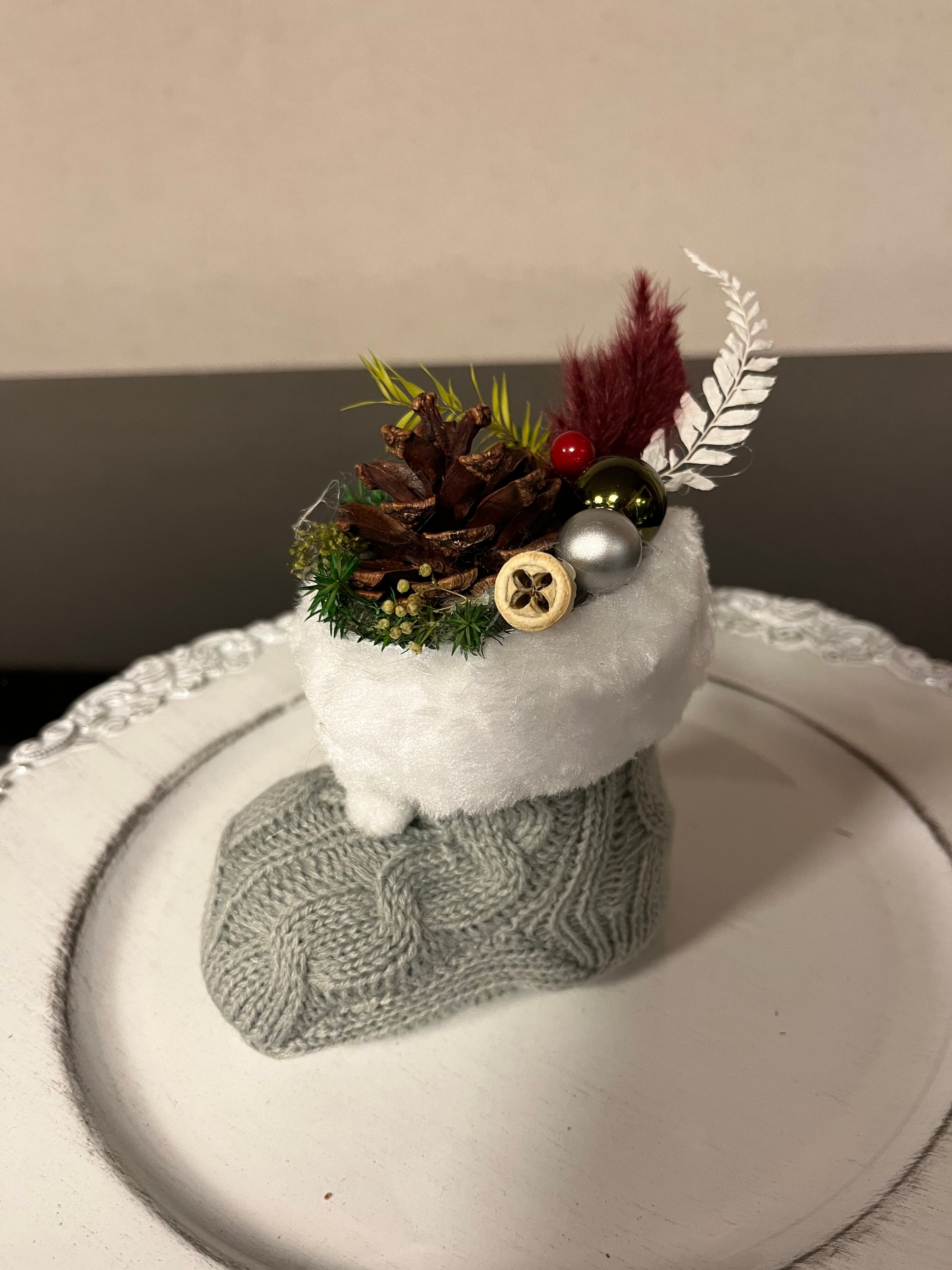 編んだソックスが暖かそうで、そこに一点一点、オリジナルのクリスマスアレンジを作成してます。