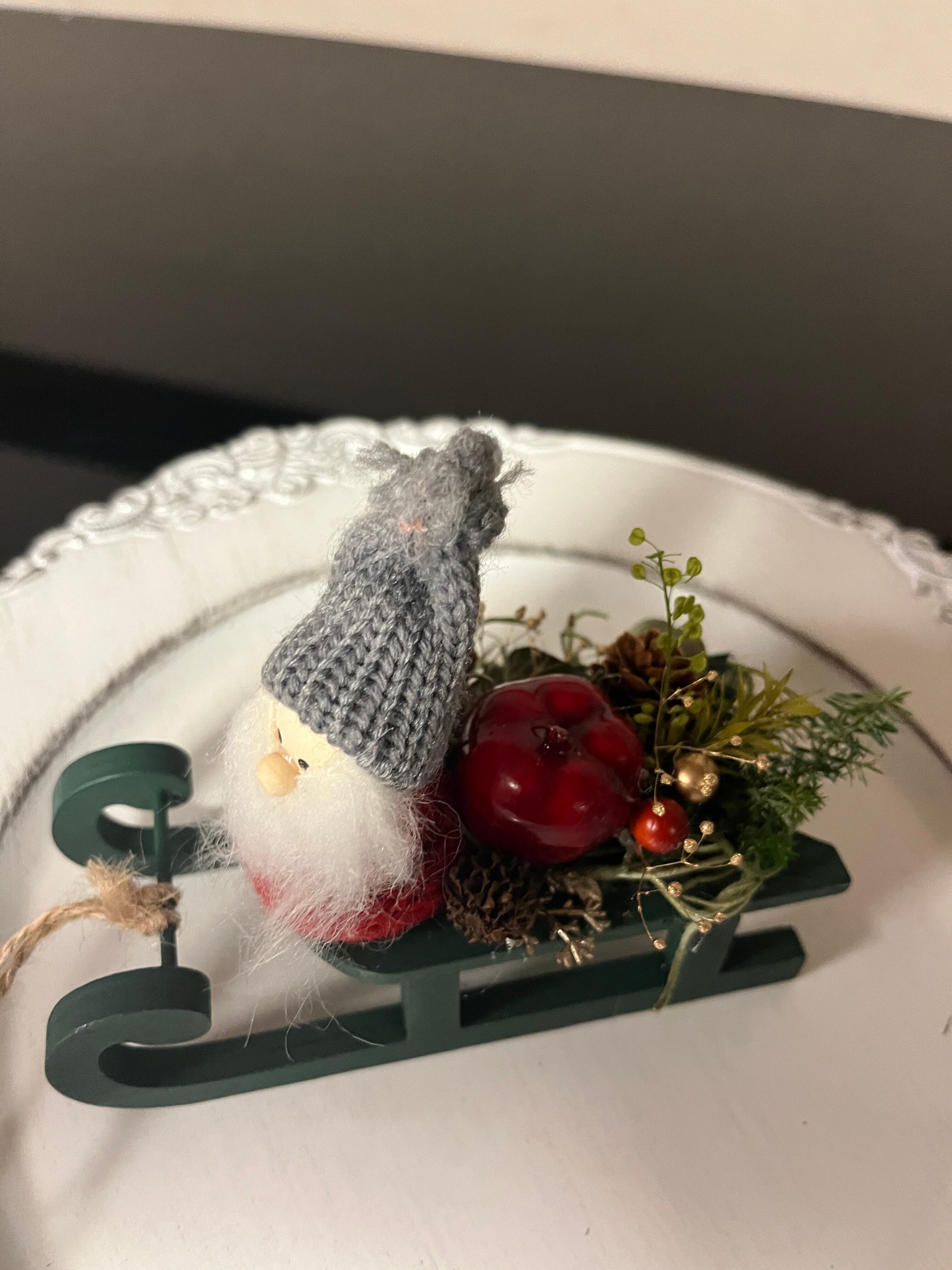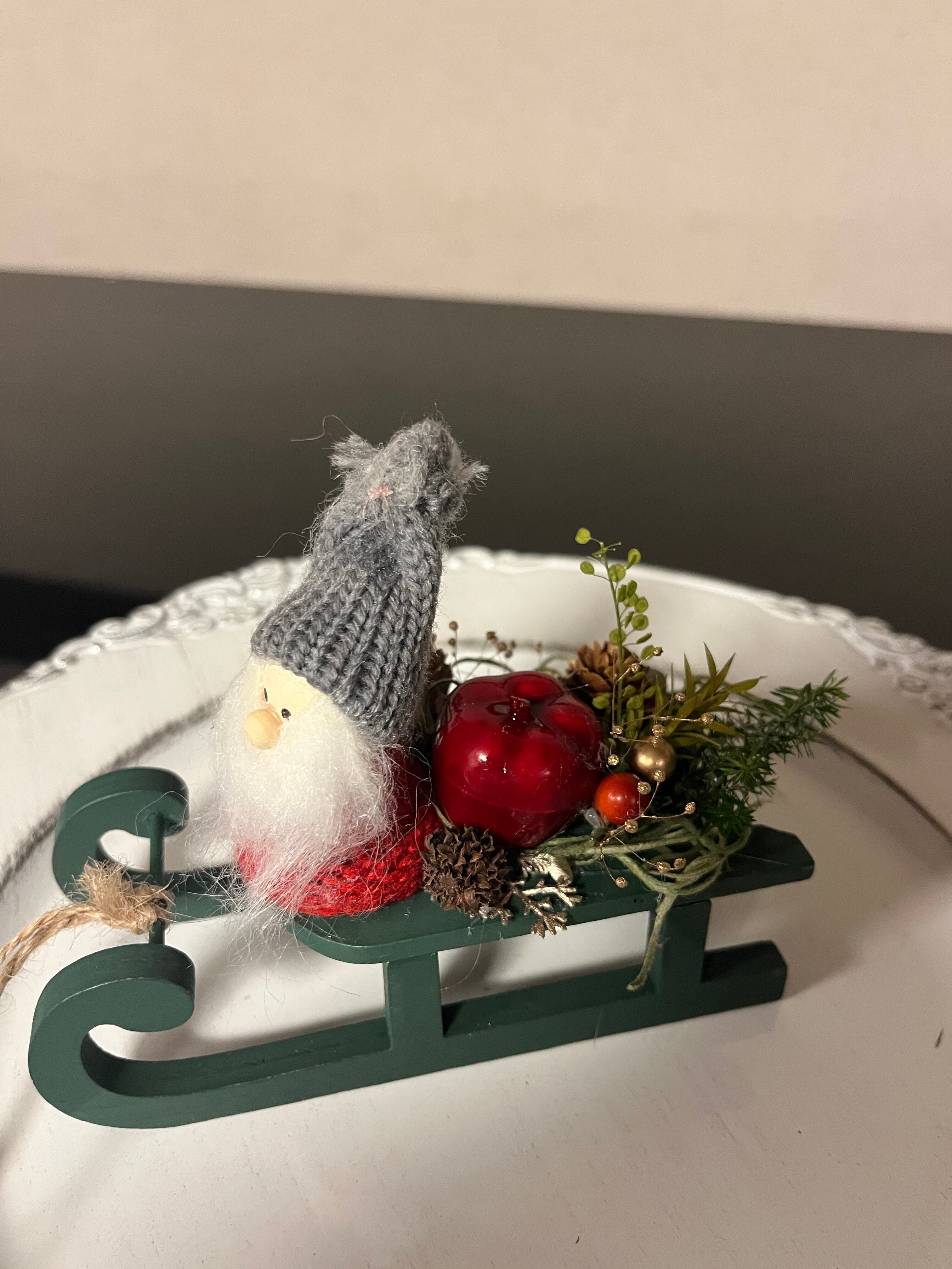 そりにサンタさんと赤りんごやなどのクリスマスアレンジをしてみました♪