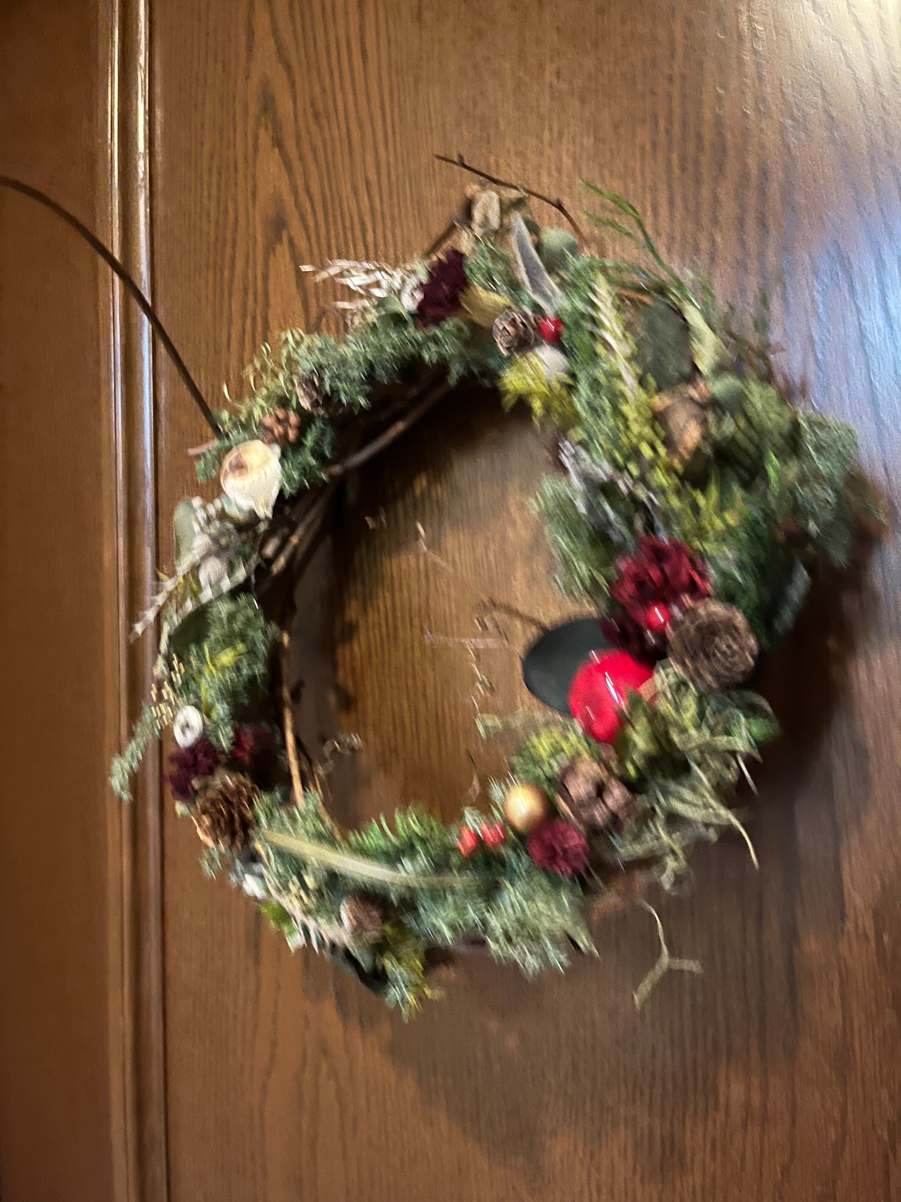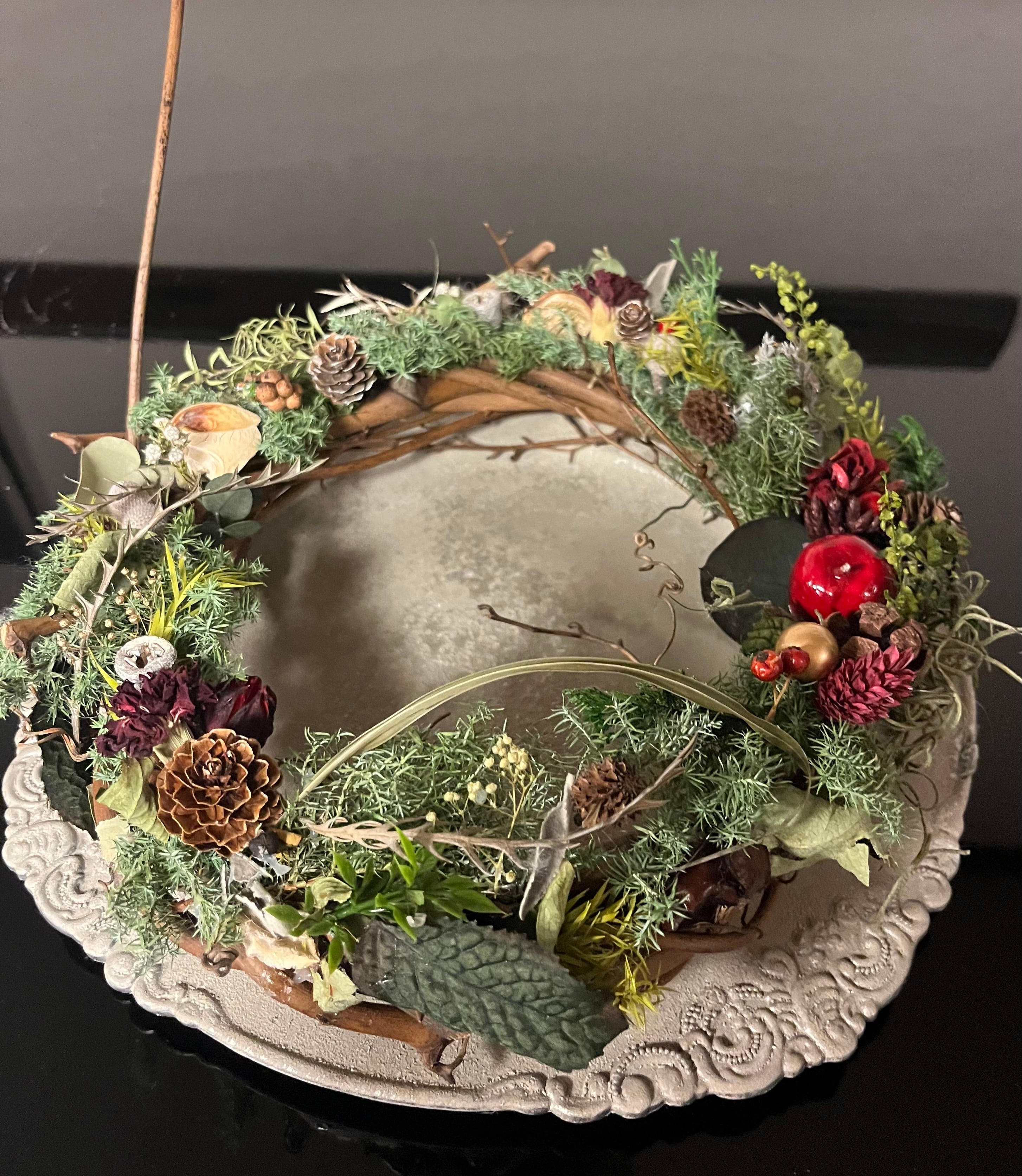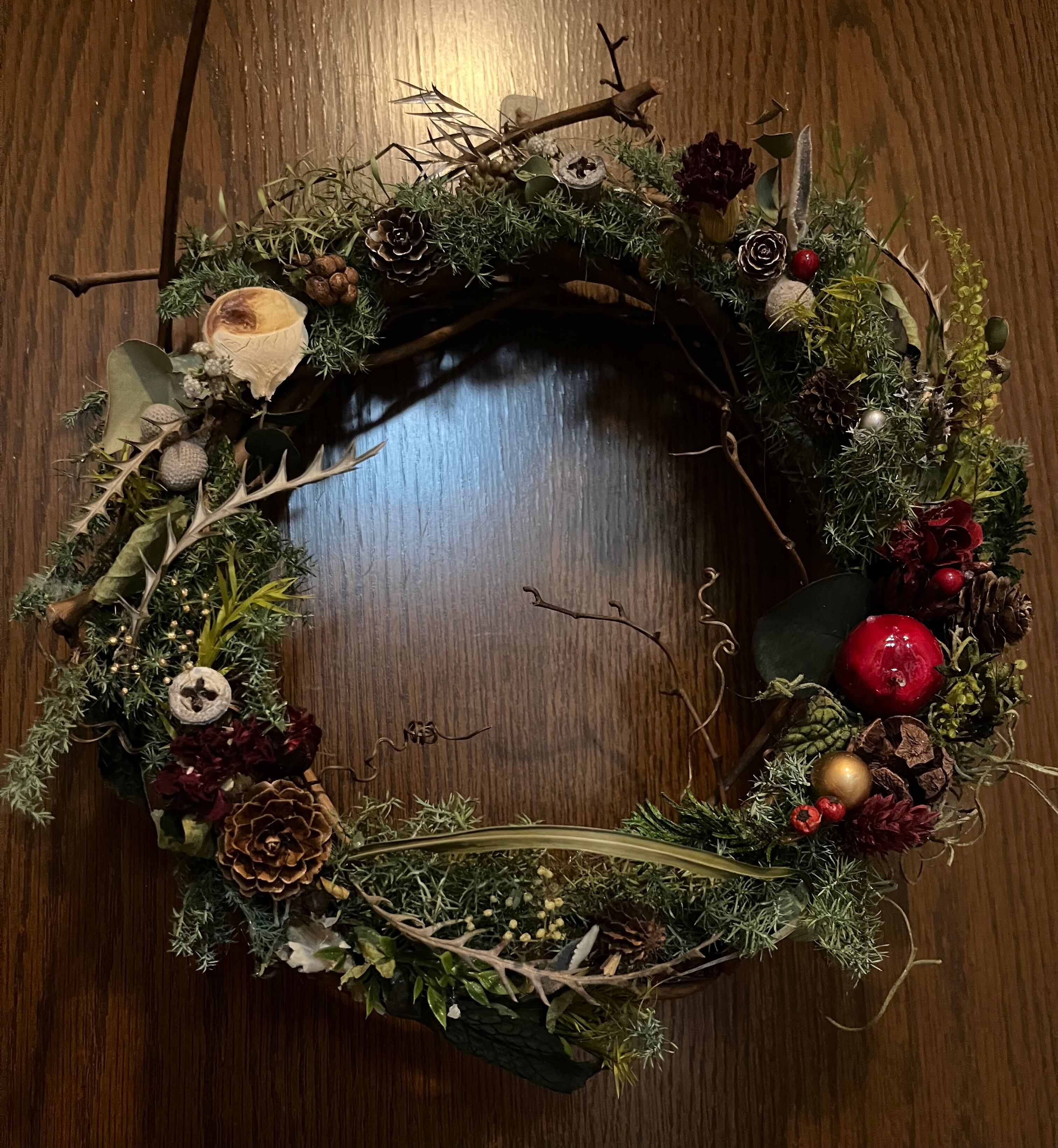 フレッシュなグリーンの葉や、造花、色々な実を使ったクリスマスリースです。
