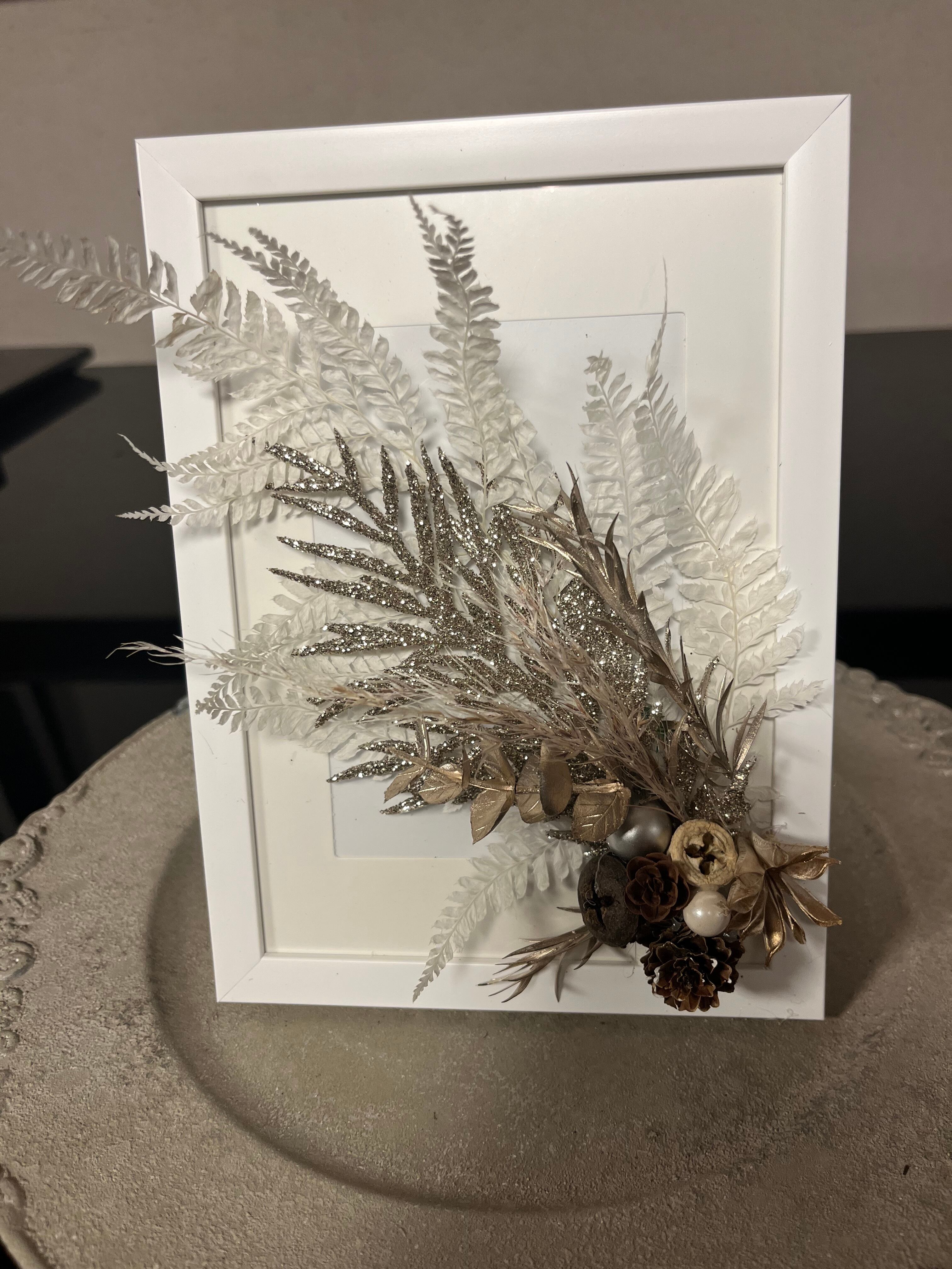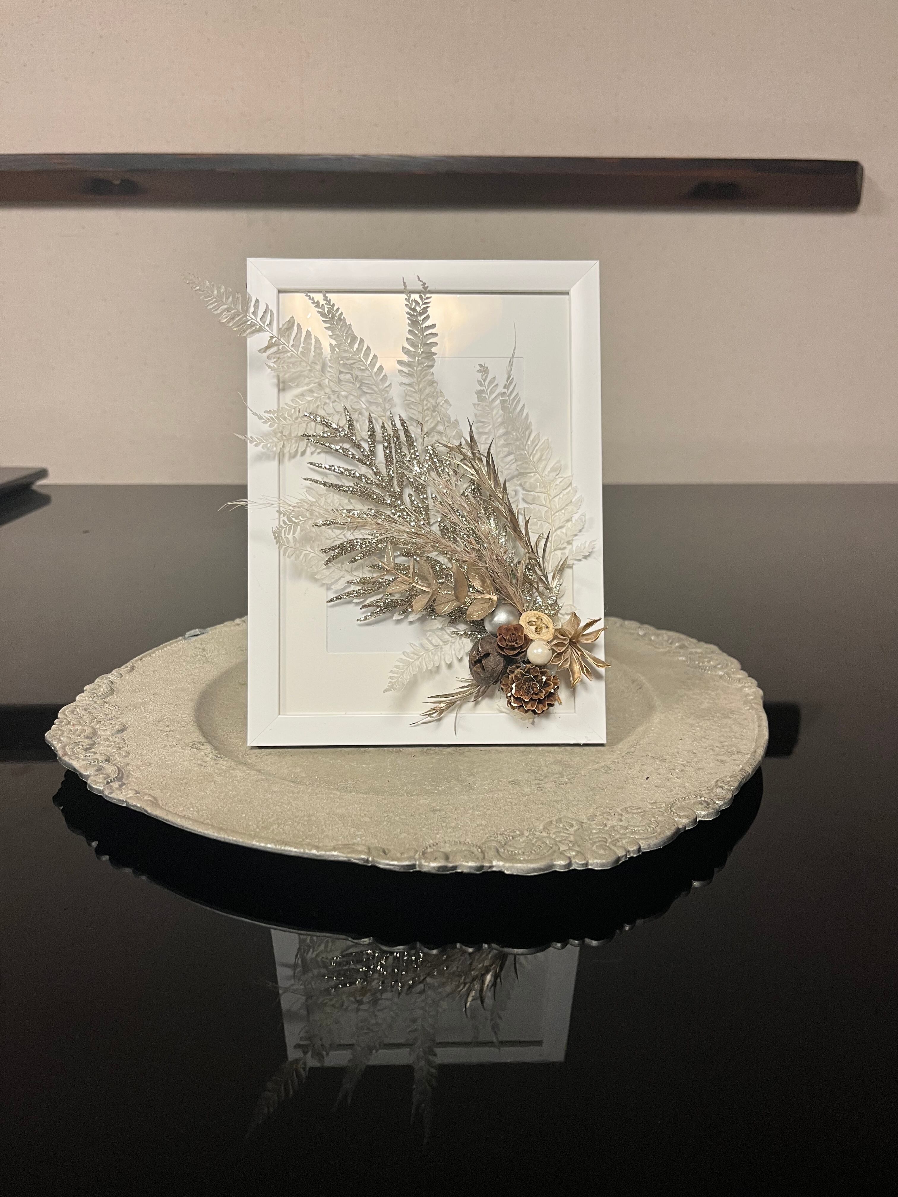 きらびやかで、でもちょっとシックなクリスマスの雰囲気の額アレンジです。 華やかなので、お正月にも合いそうなアレンジを作成しました。 縦20㎝横17㎝幅7㎝