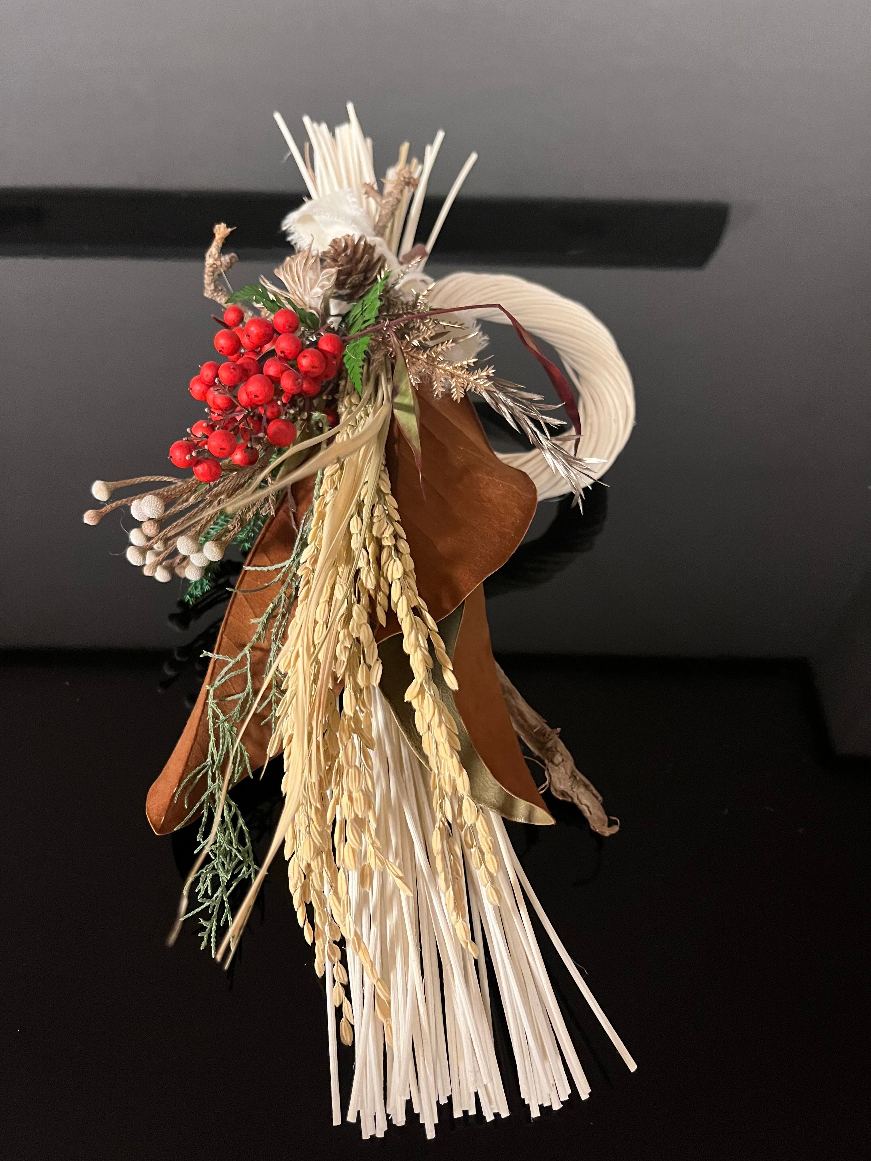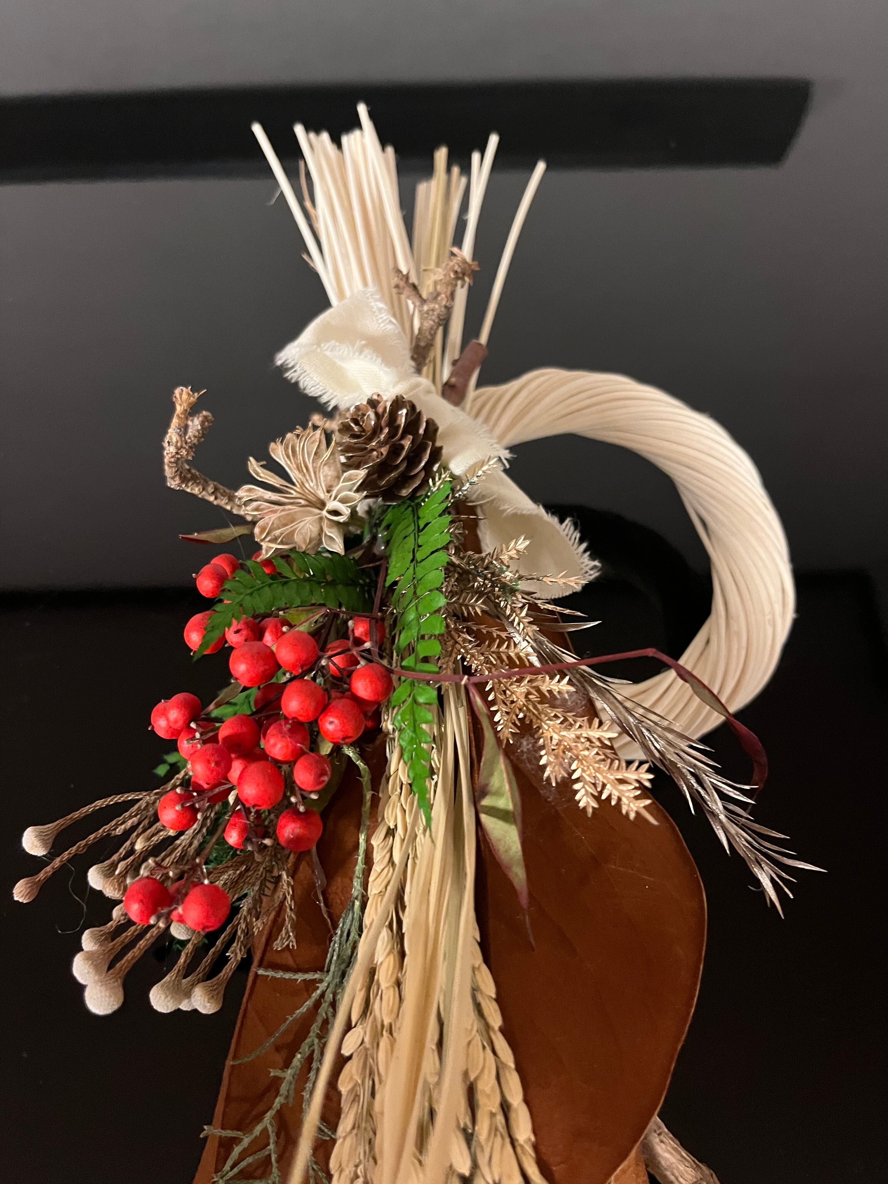 ホワイトの縄にたくさんの実物などでアレンジしました。しっかりしたしめ縄です。