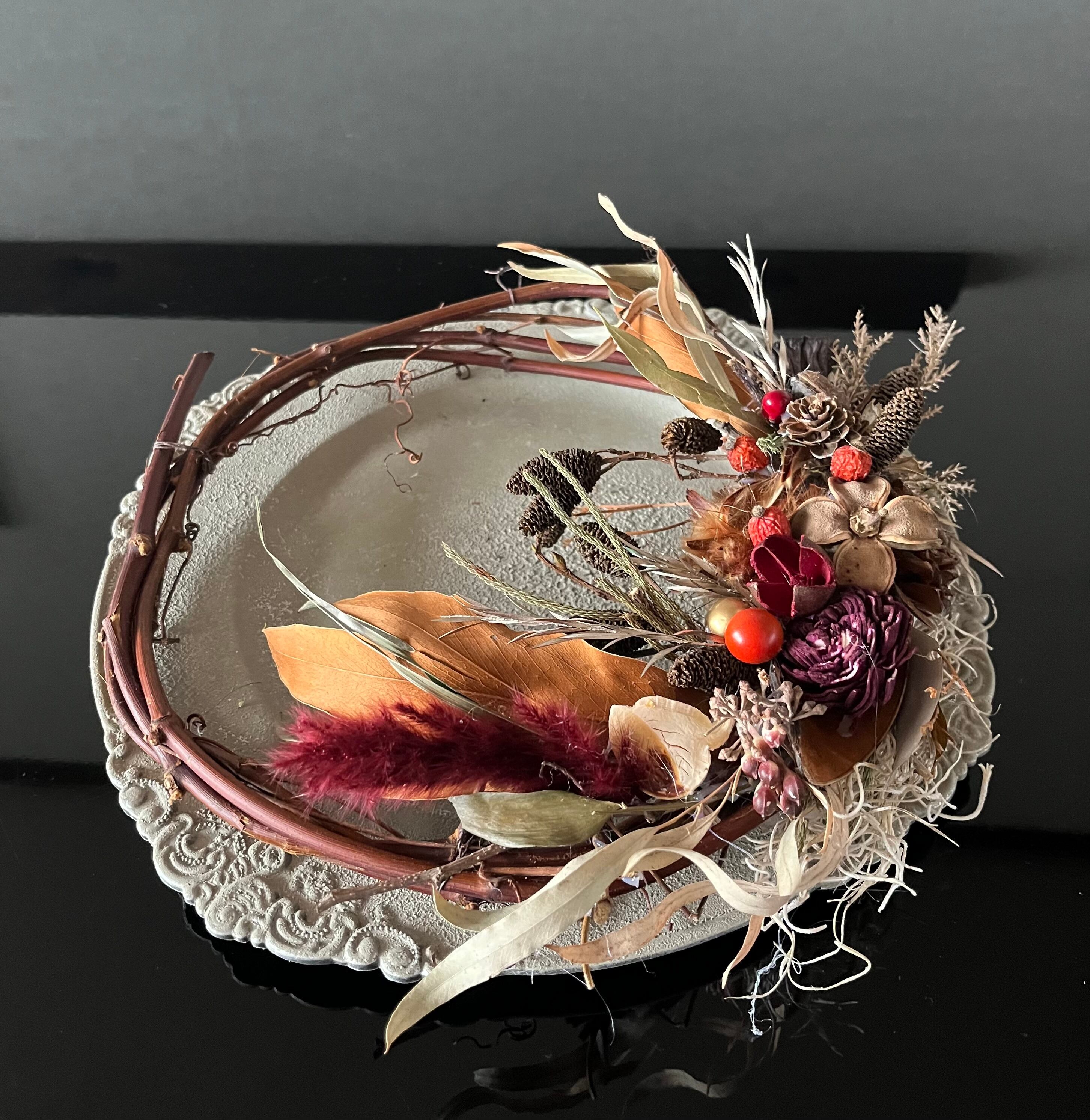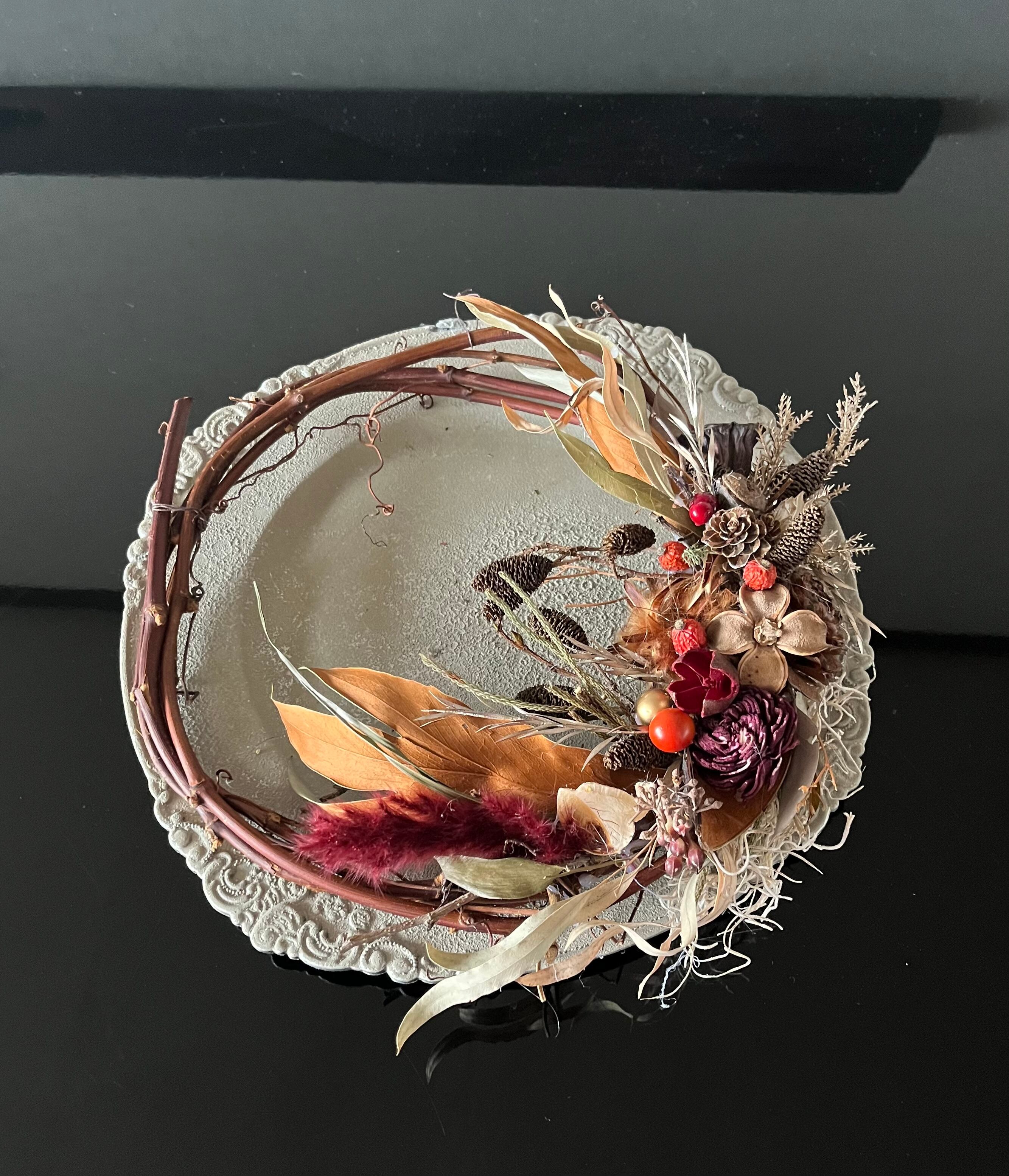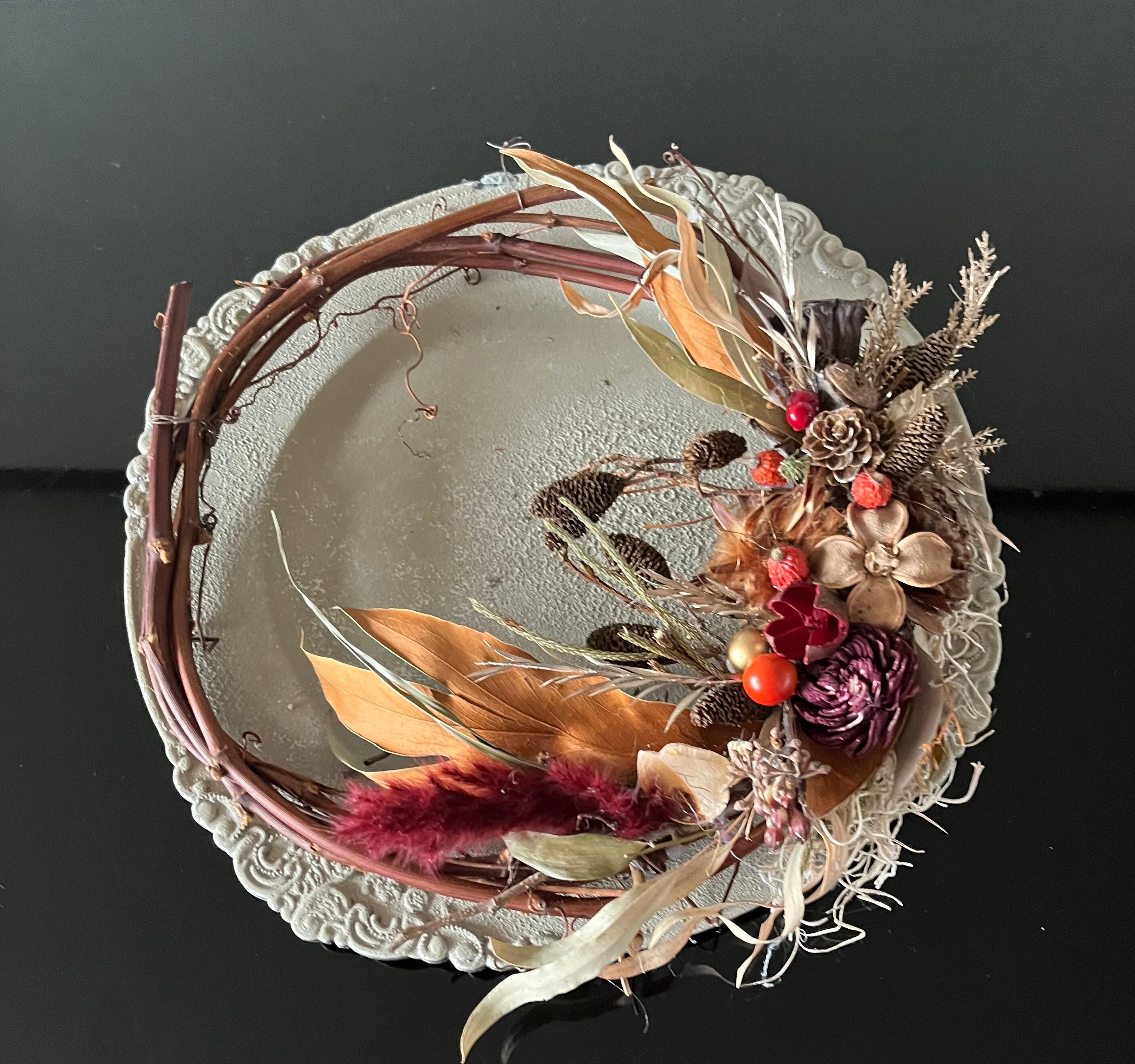 葡萄の蔓を使った冬の実物を使ったリースです。