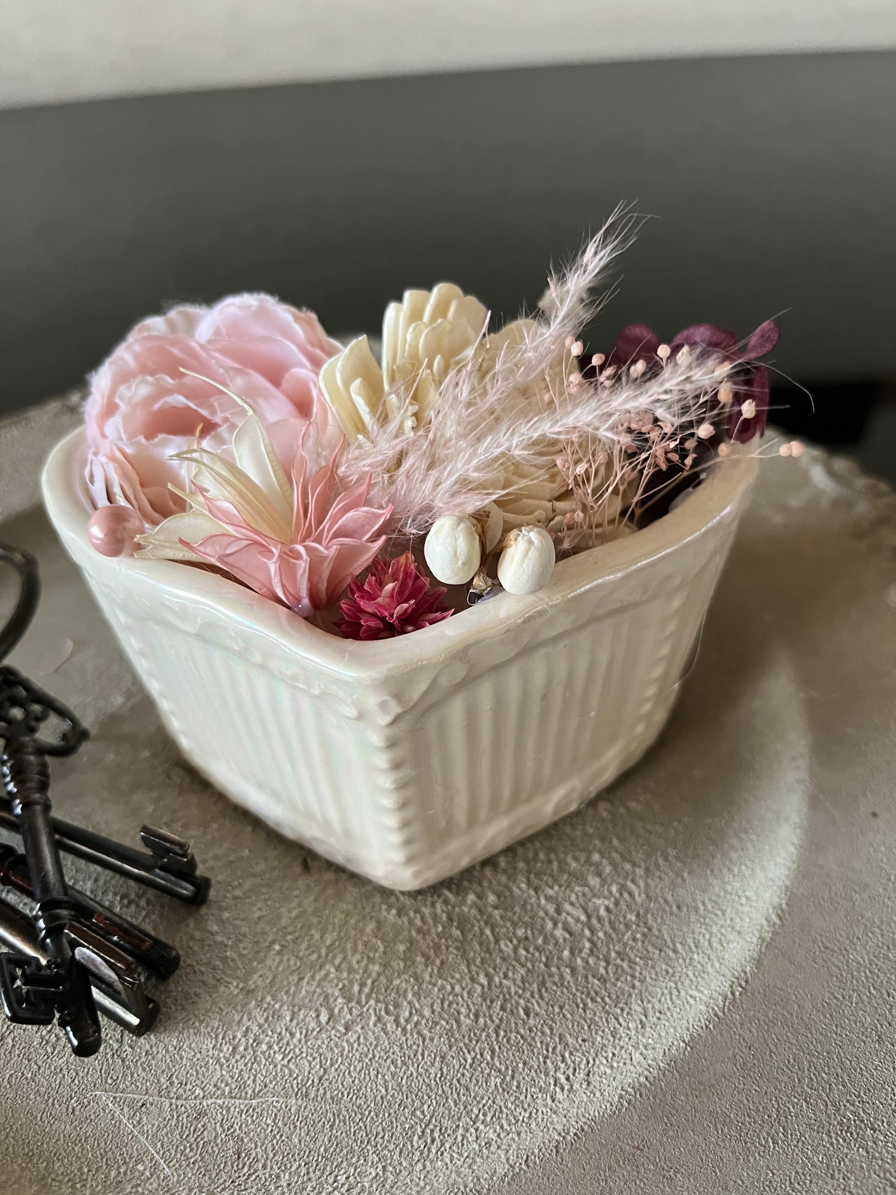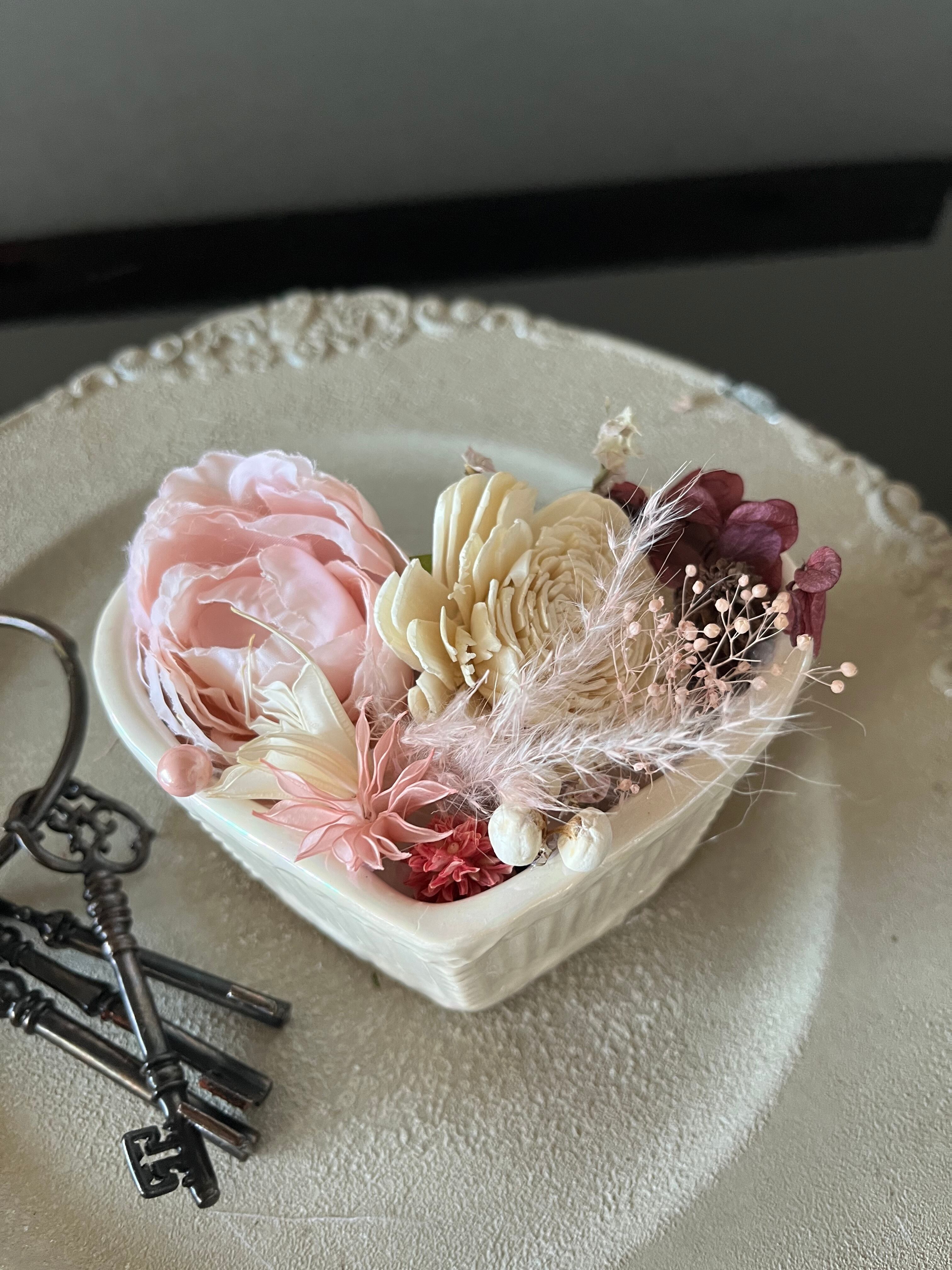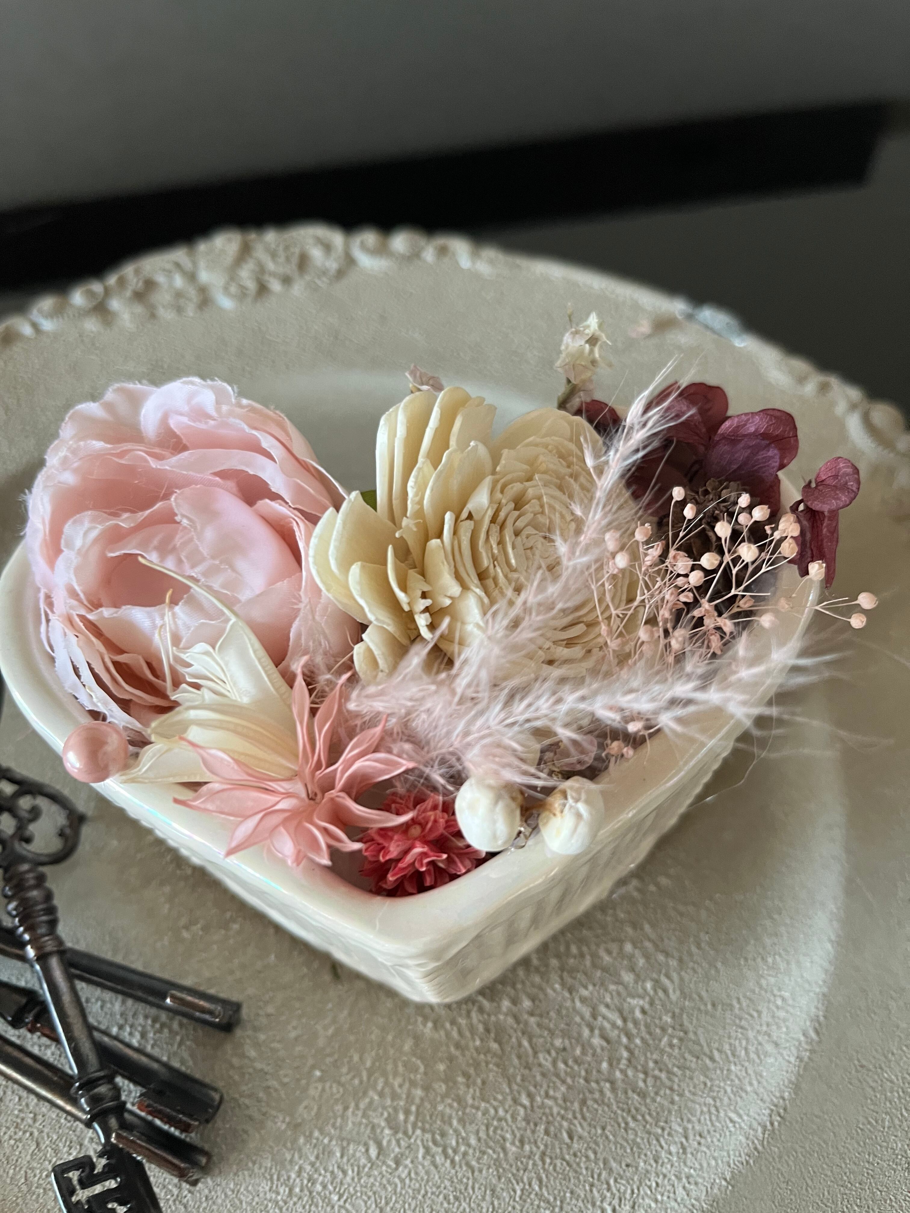 白い陶器のハートの器に、ドライフラワー&造花でアレンジをしました。 バレンタインの雰囲気などに。❤️ 縦7cm横12cm高さ7cm