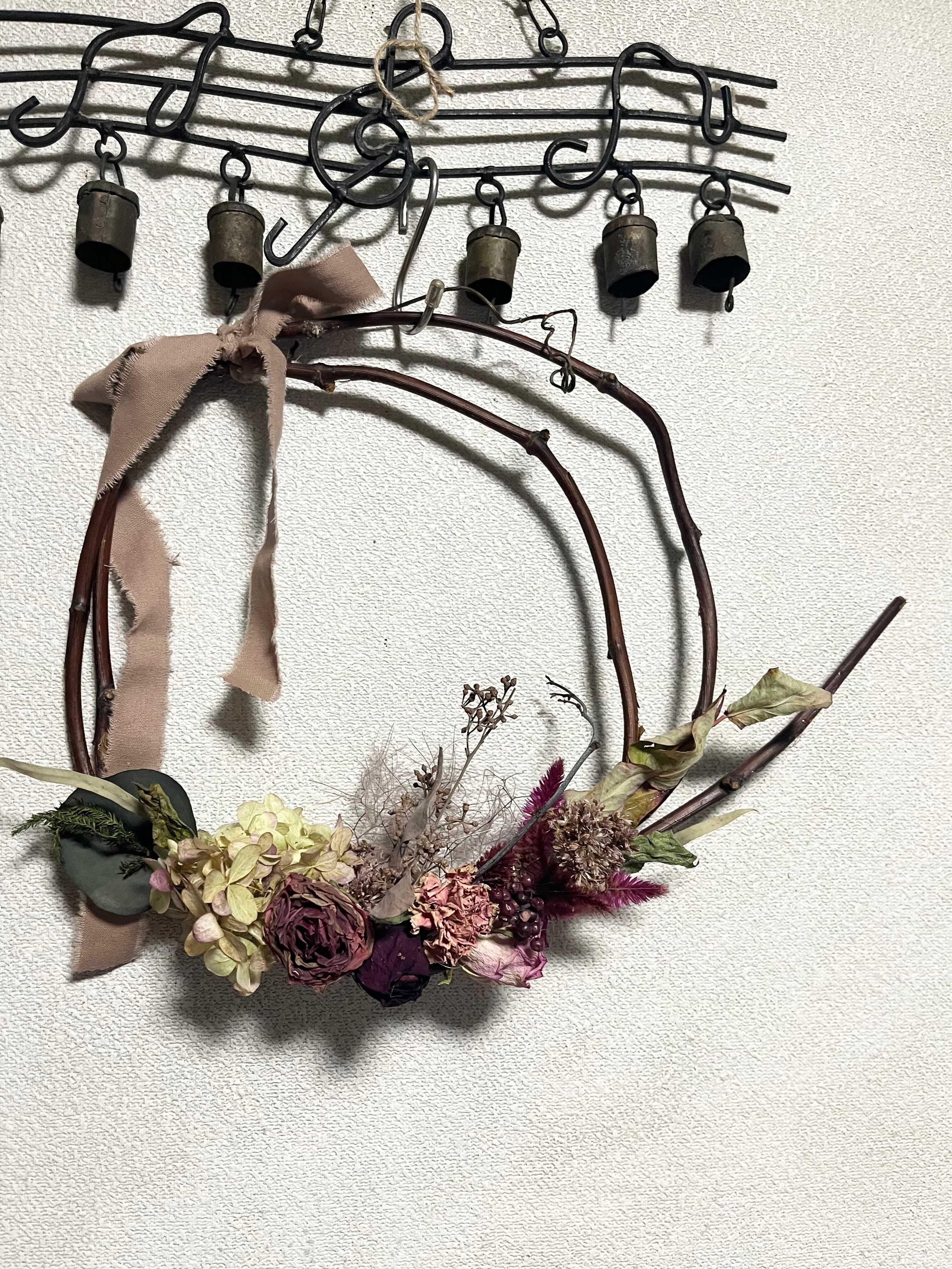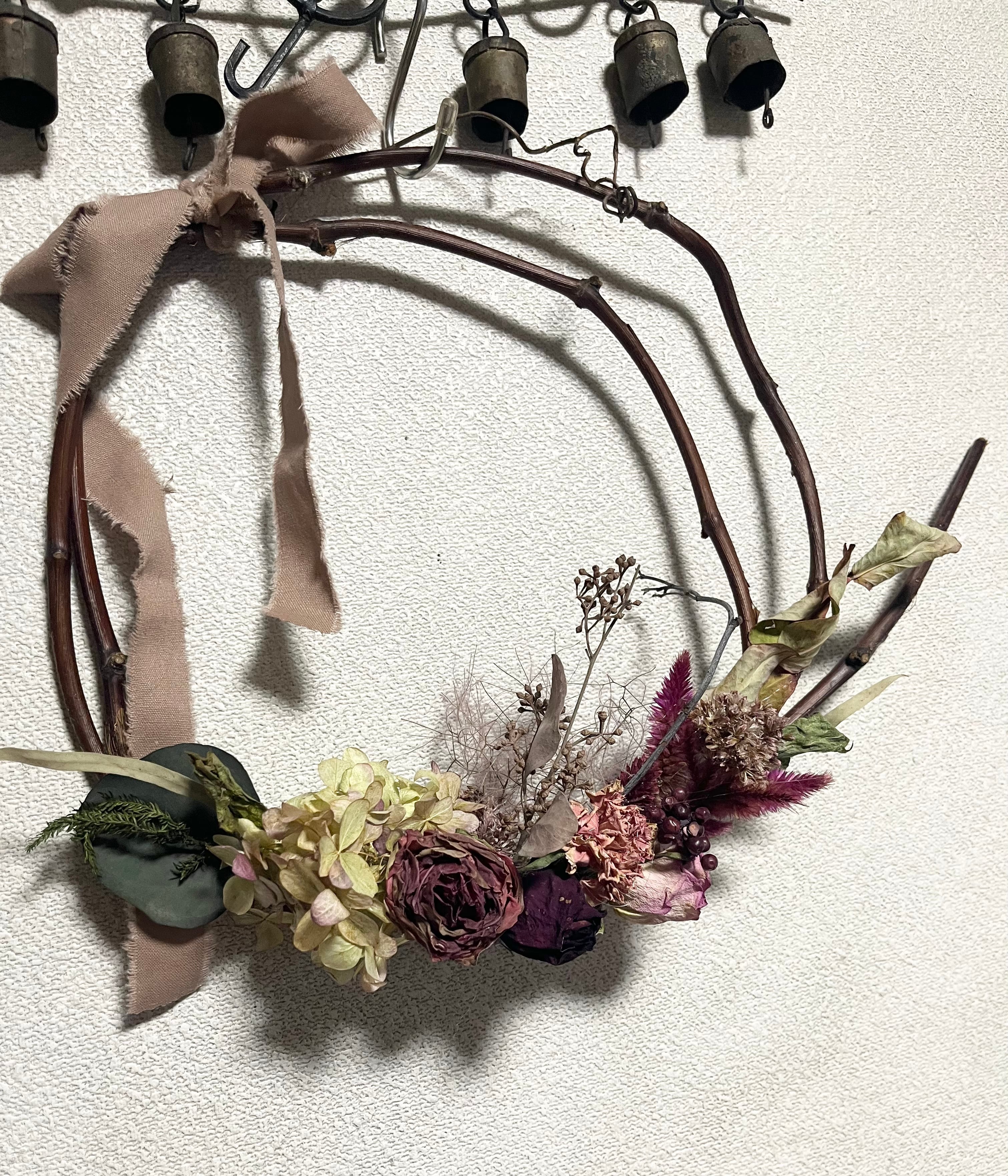 葡萄の蔦でドライフラワーを中心にリース仕立てにしました。