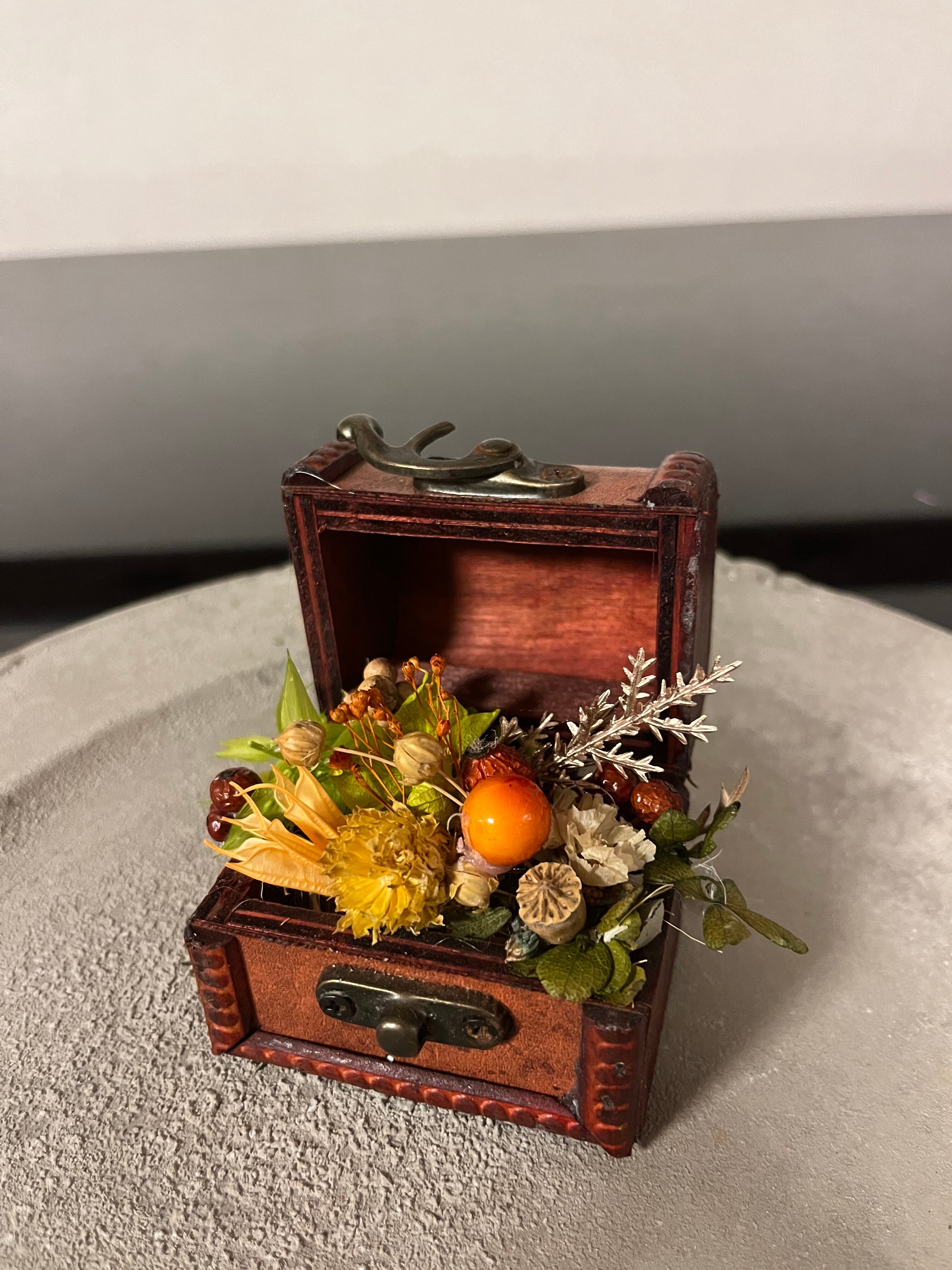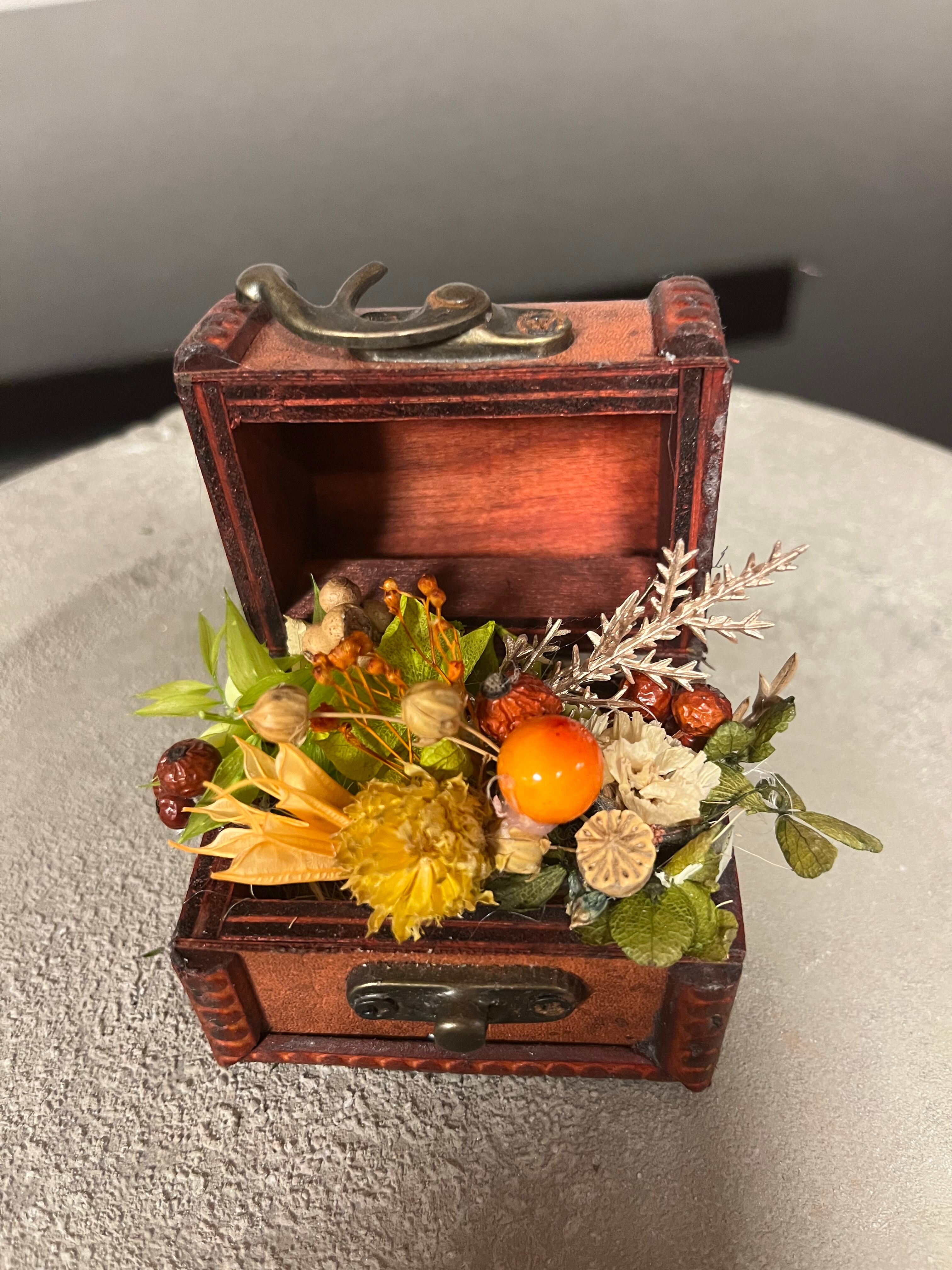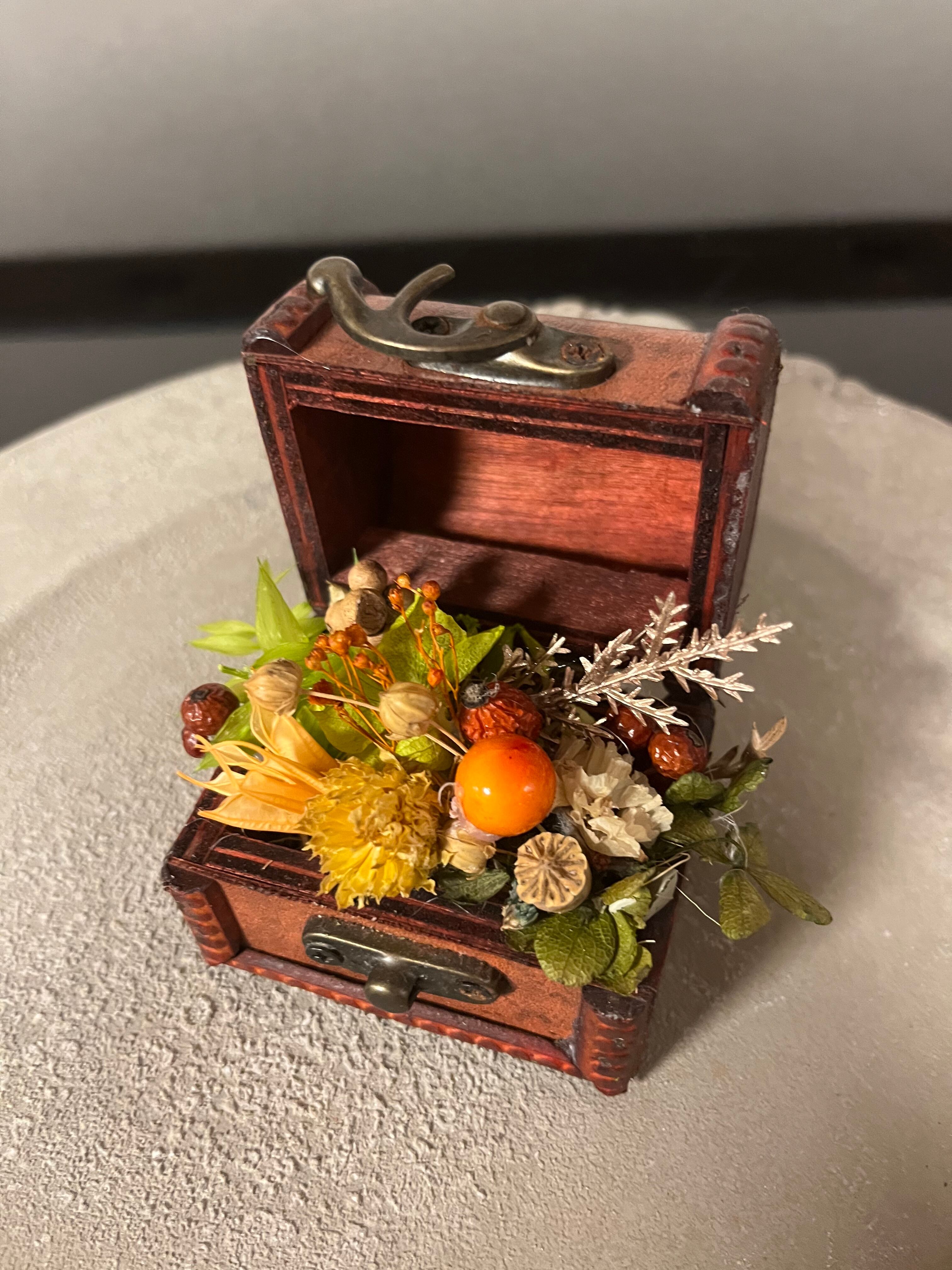 オレンジ色を基調にしたアンティークな雰囲気の宝箱アレンジです。