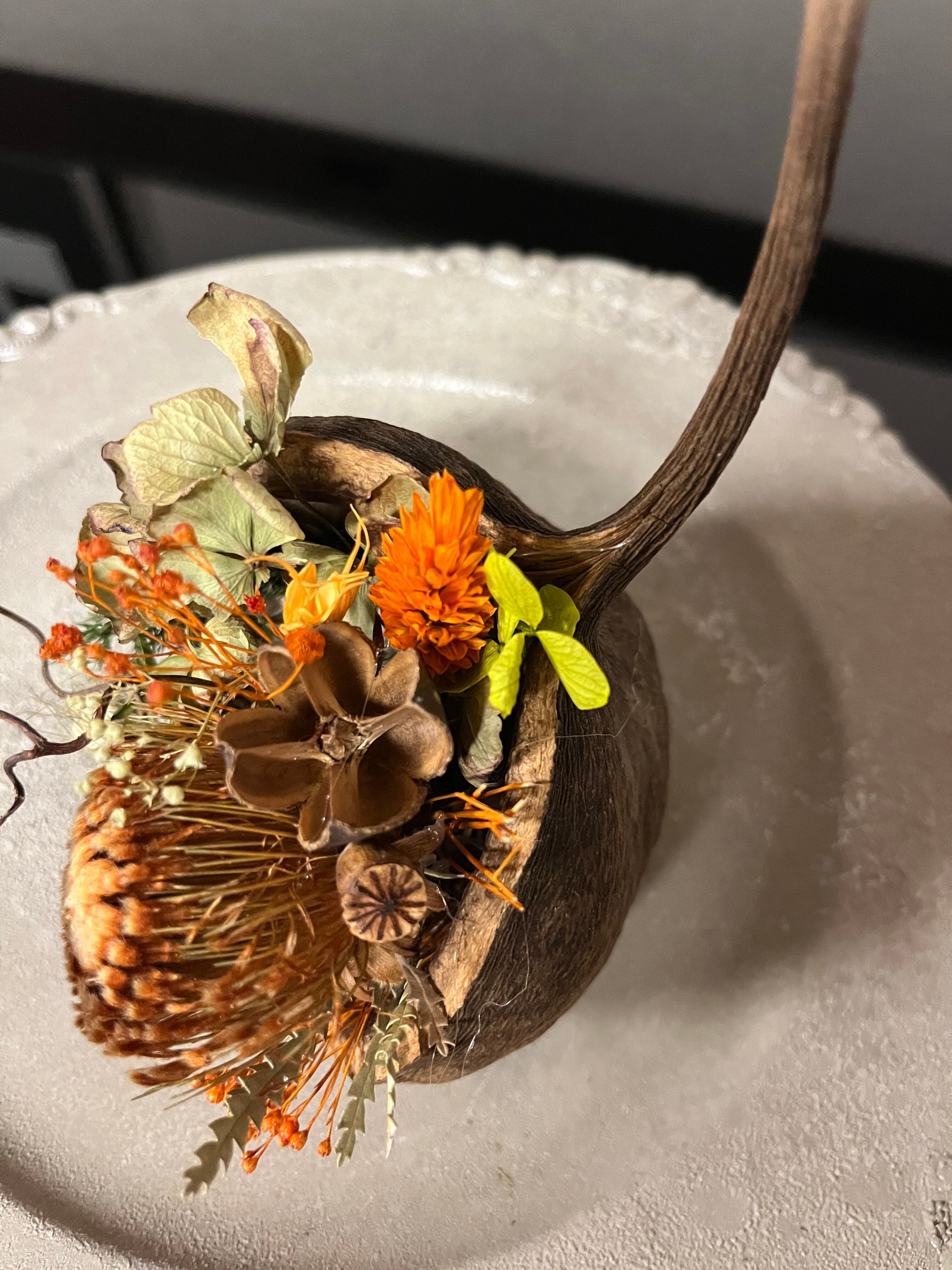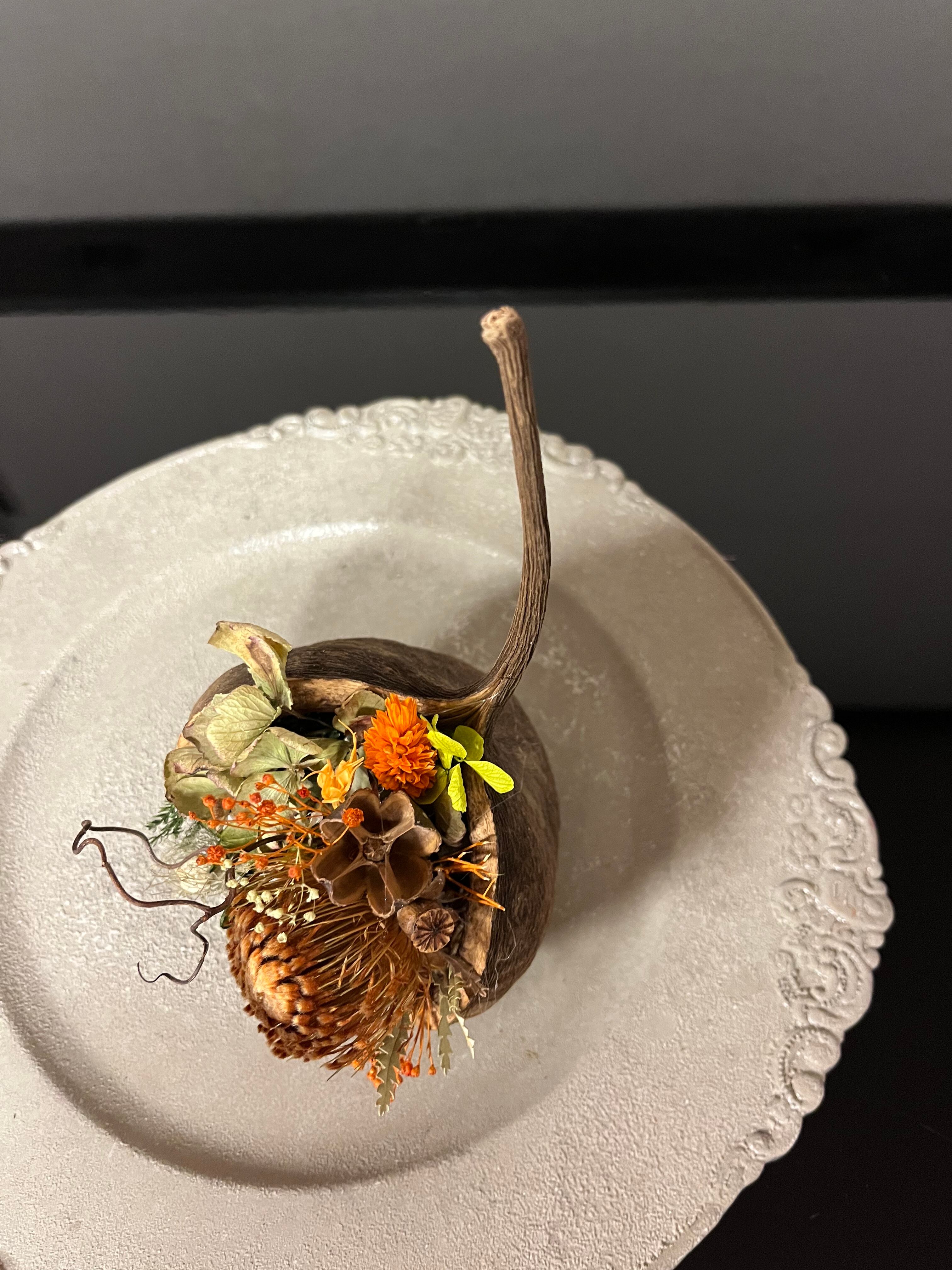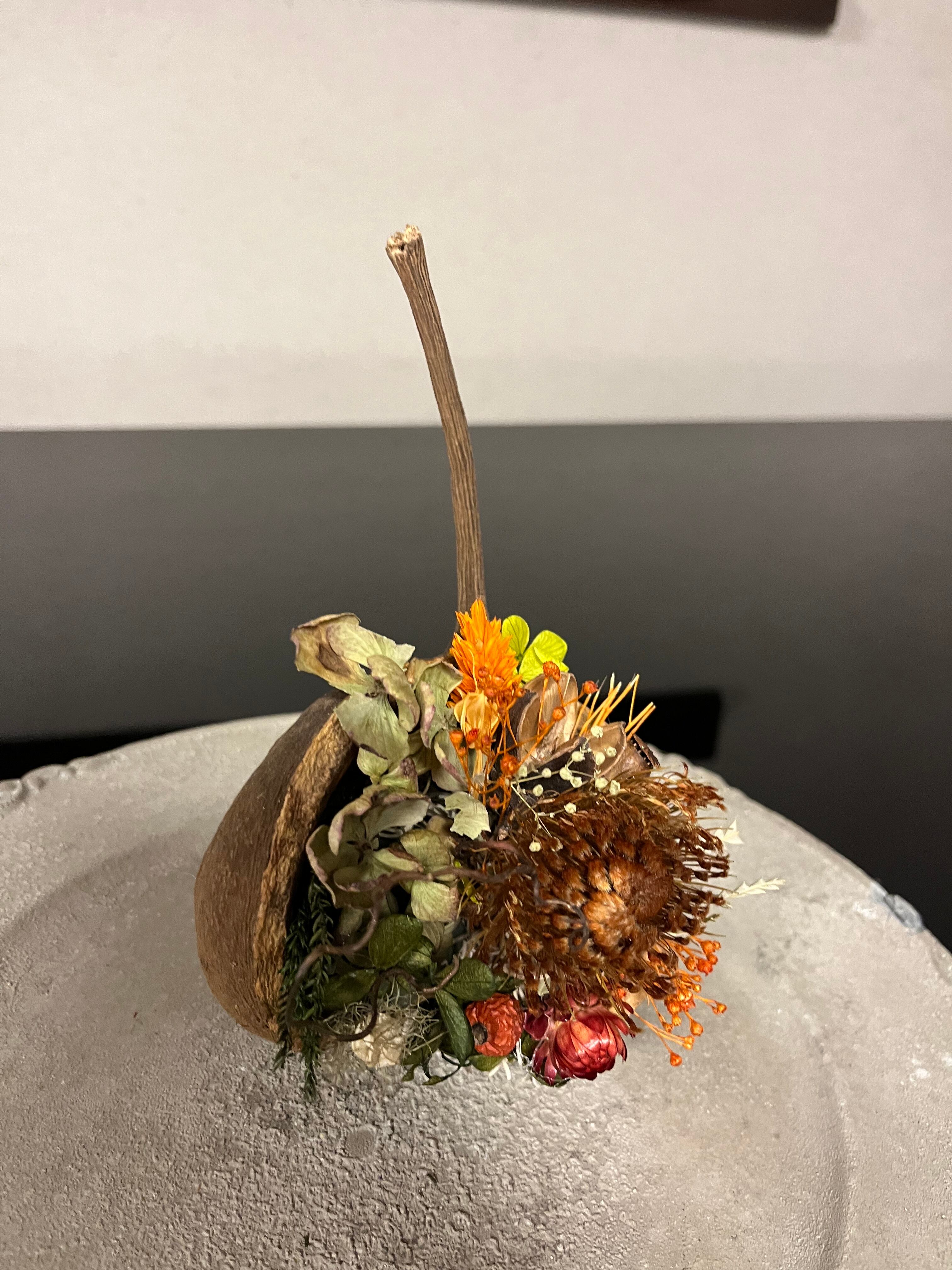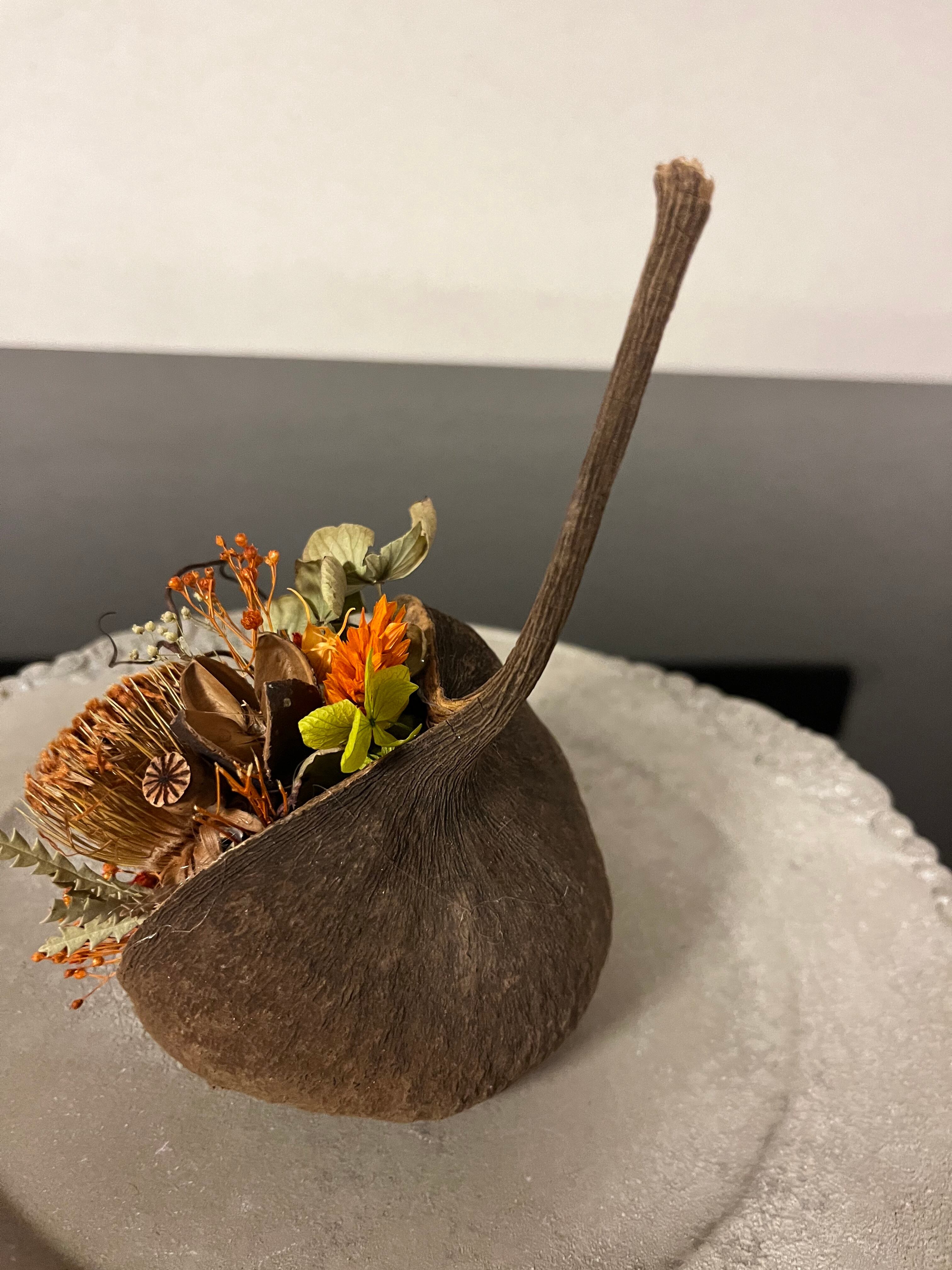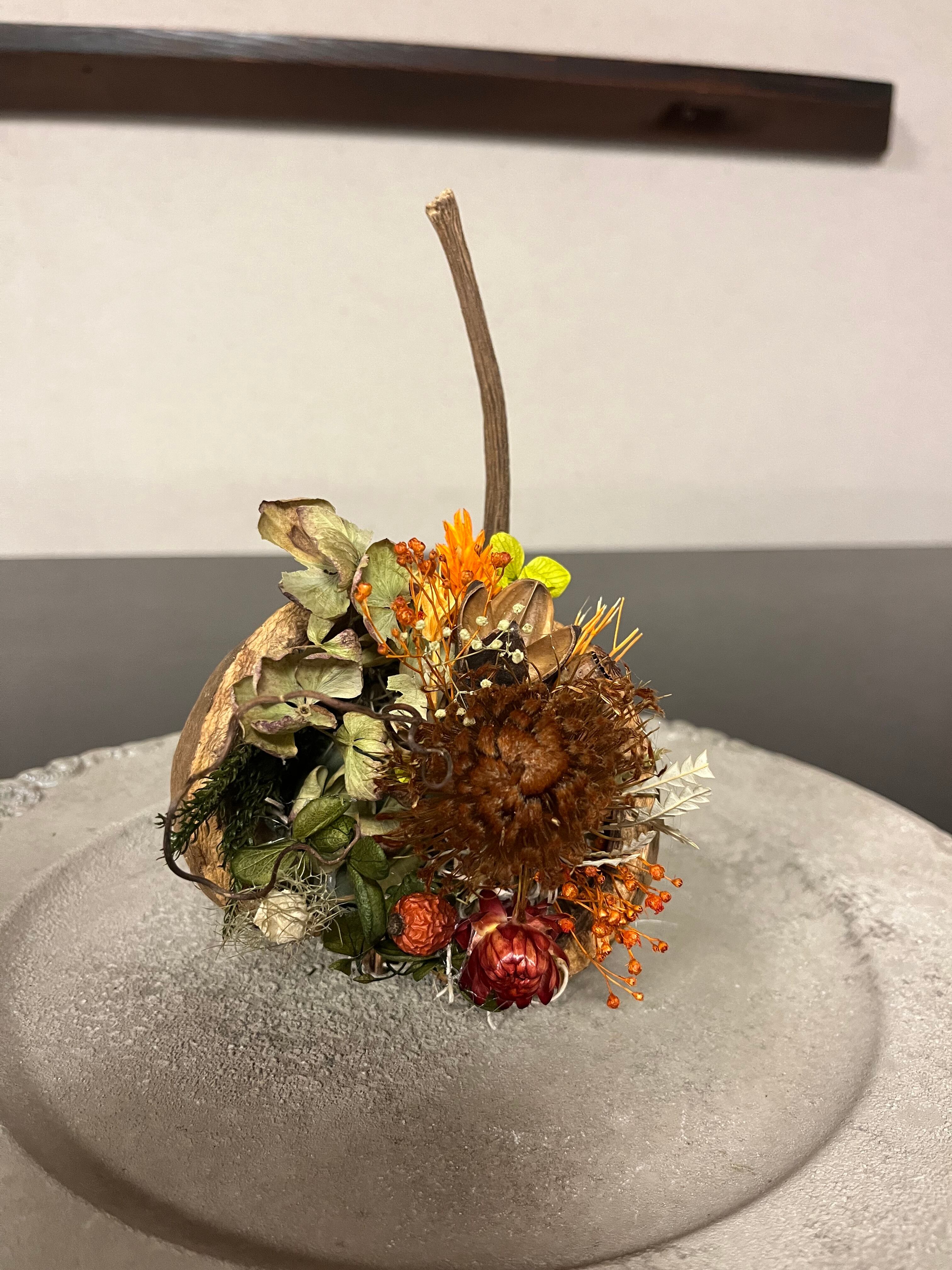ブッダナッツの殻に渋めのドライフラワーをアレンジしました。