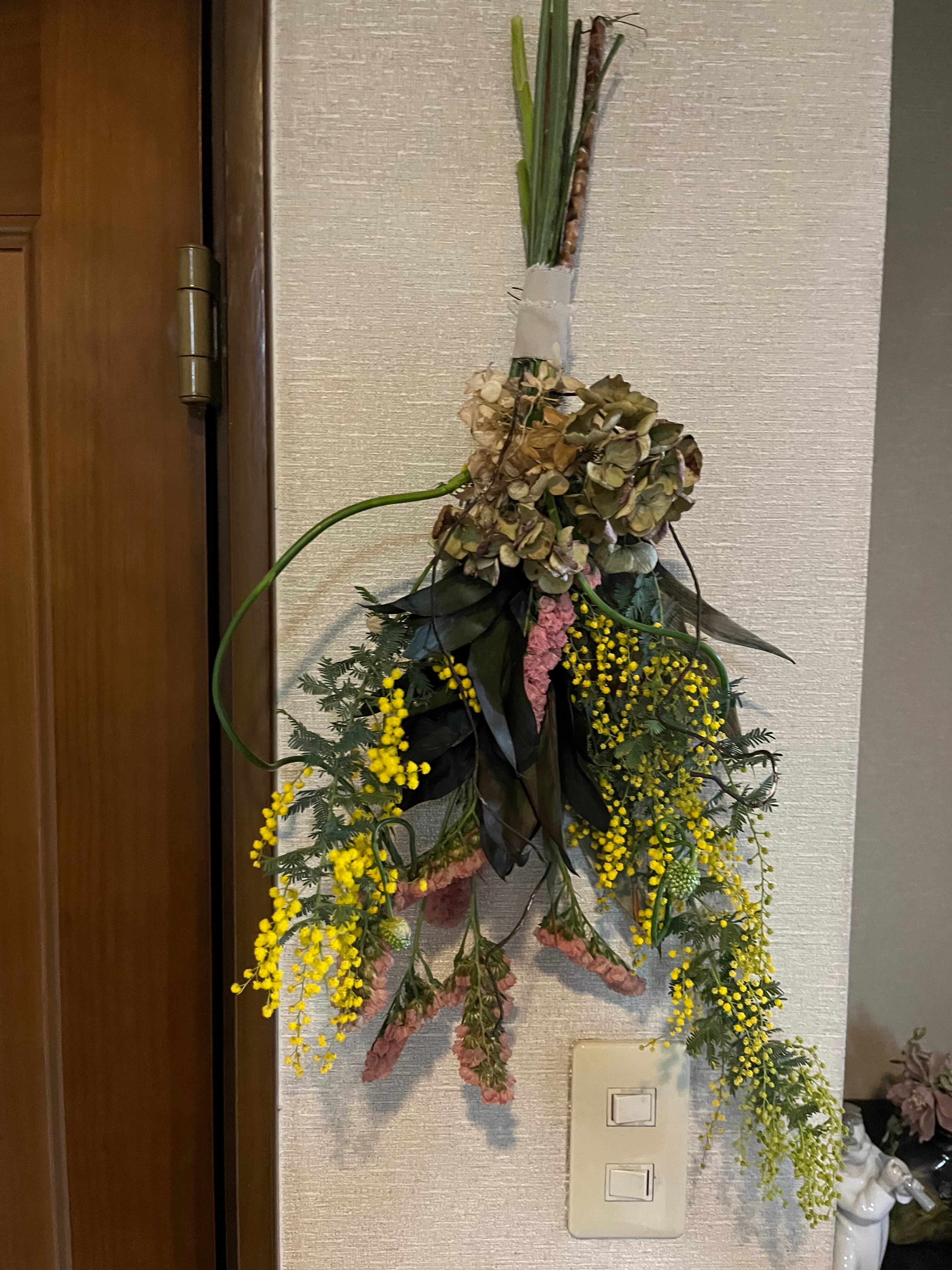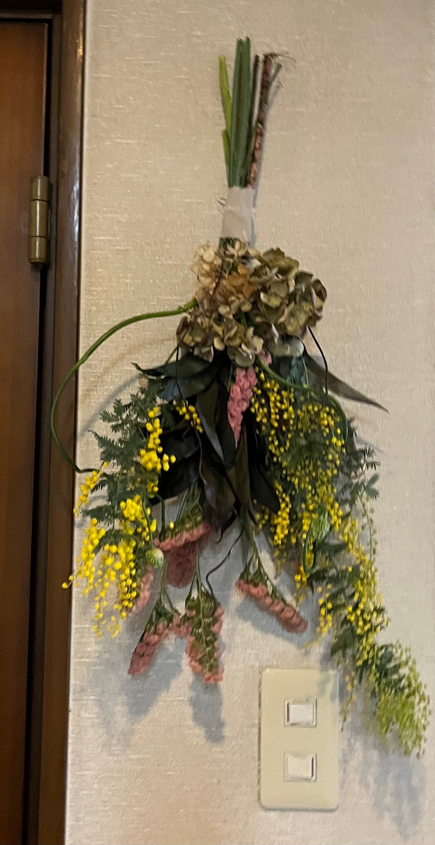 ミモザと、ちょっと深いグリーンの葉、渋い色の紫陽花にアレンジをアクセントにした、ちょっと渋めのスワッグです。