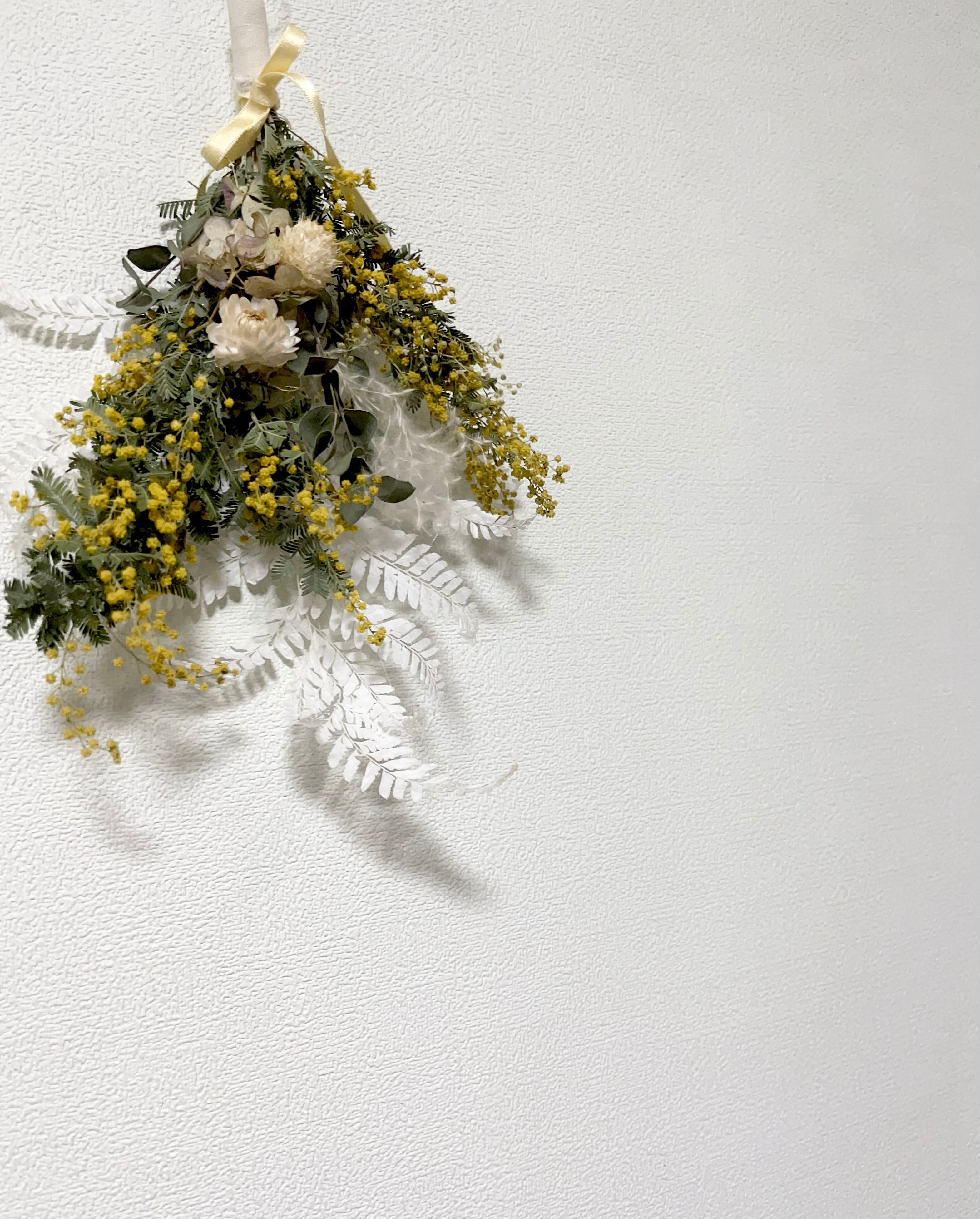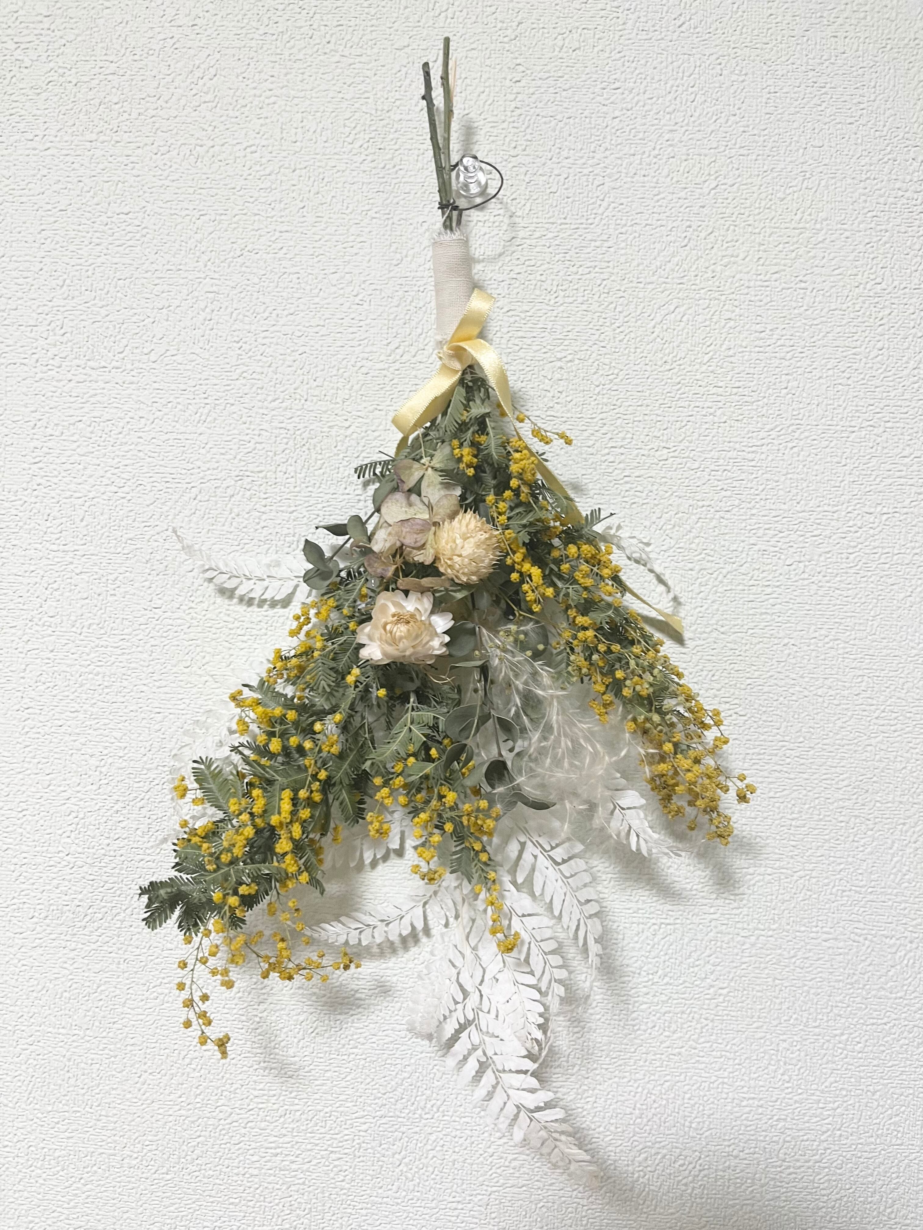 爽やかな春のイメージで、ミモザと白い花材を使ったスワッグです。