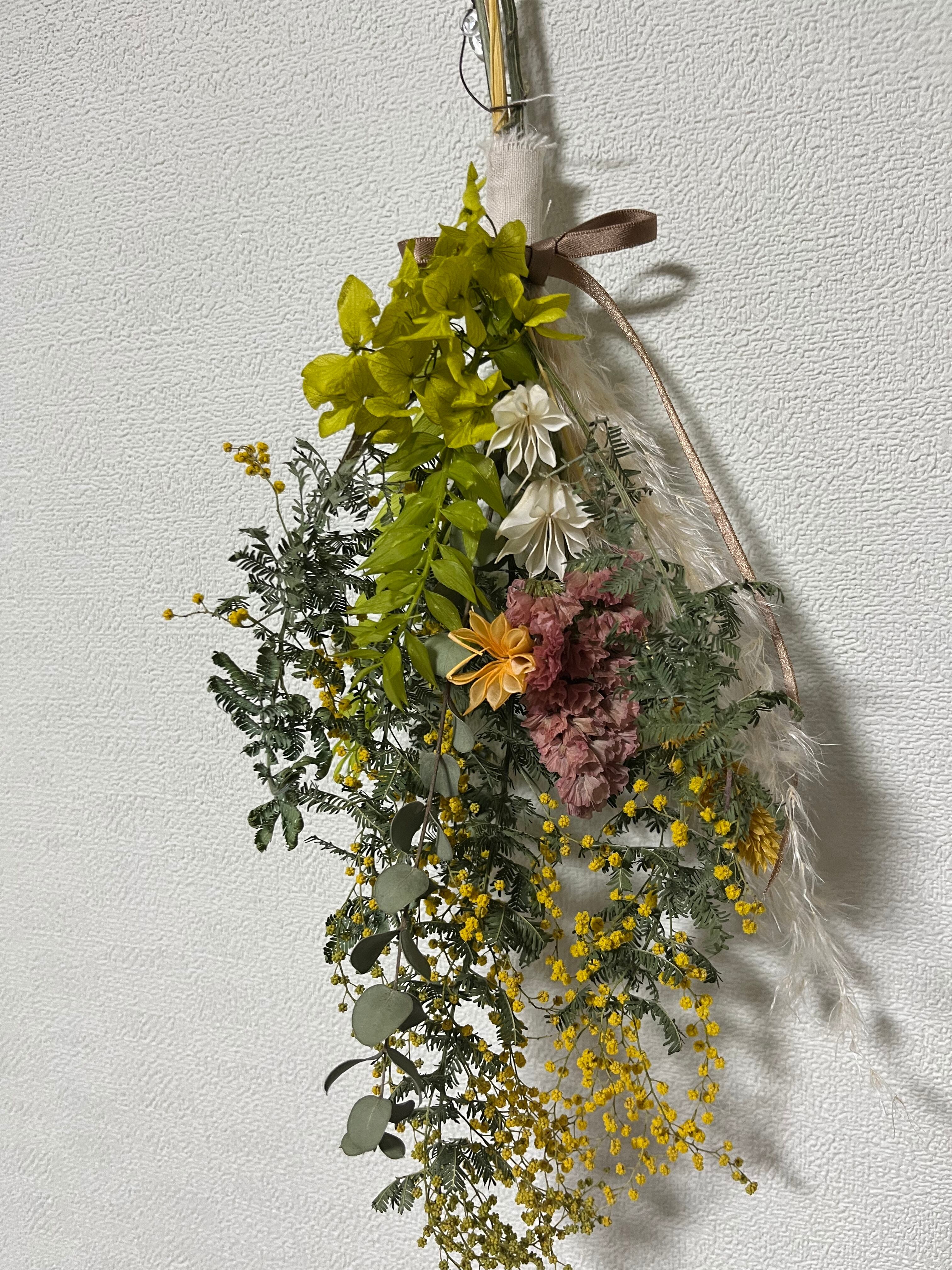ミモザを一本使って、たっぷりなミモザと、オレンジ系の花材などをアレンジし、ちょっと可愛い雰囲気で作成しました。