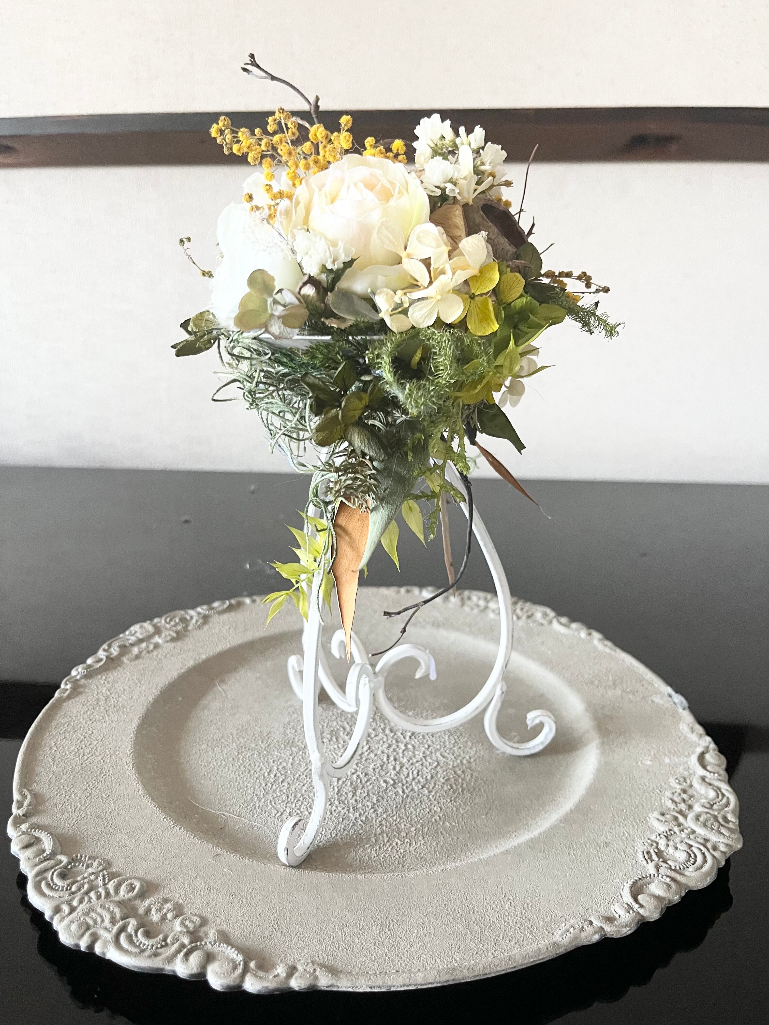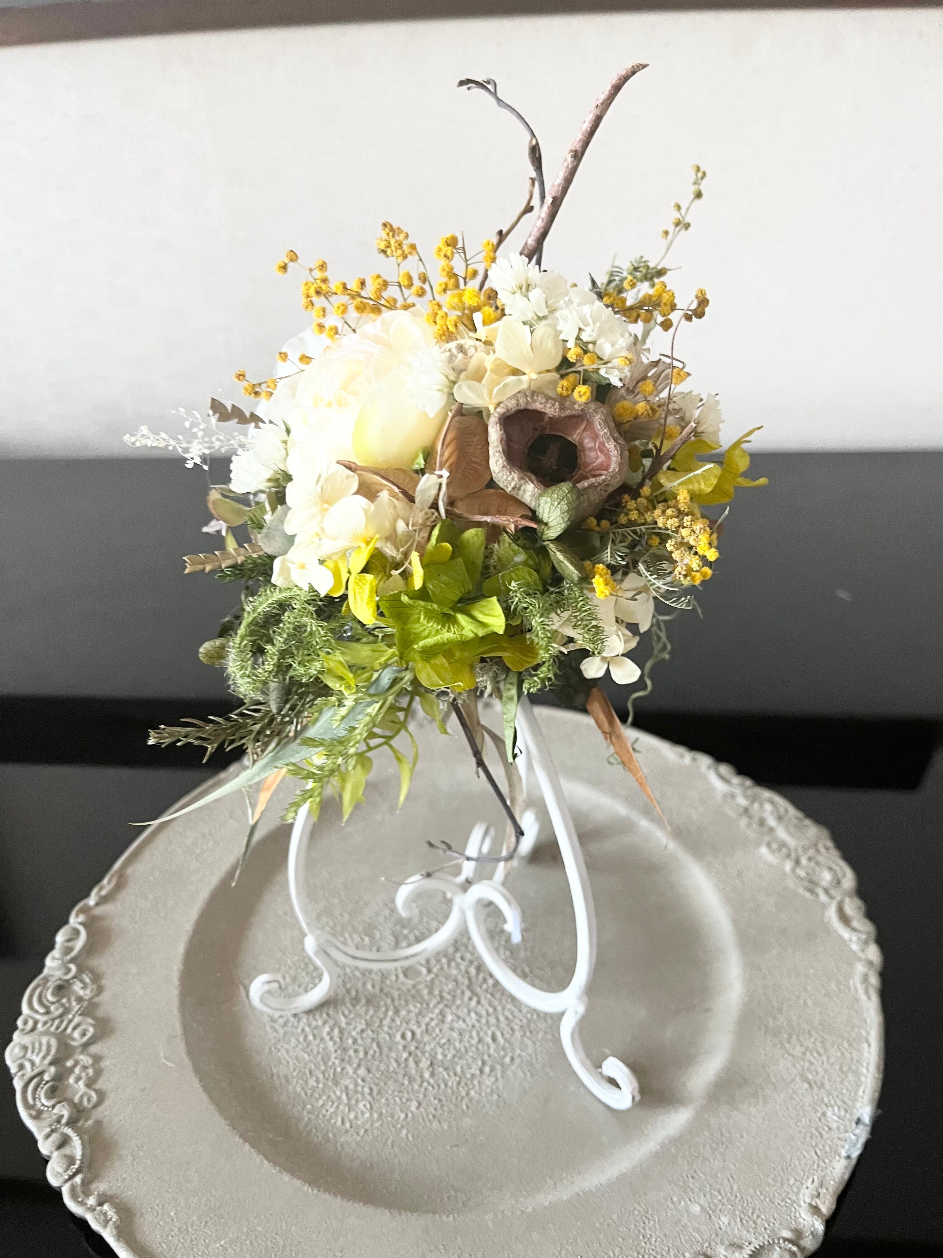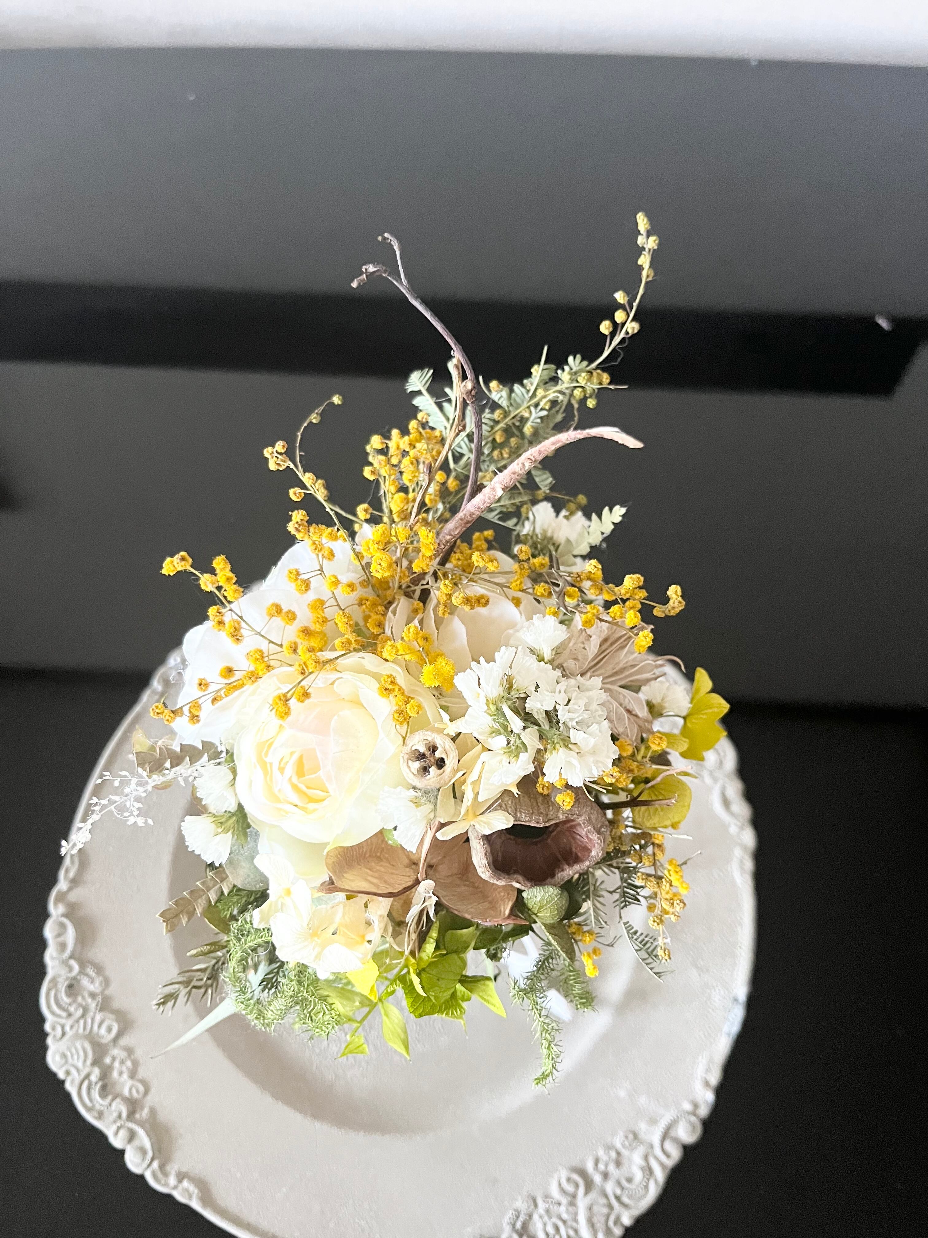 ミモザを使って、ドライフラワー&造花で春のオブジェを作成してみました。