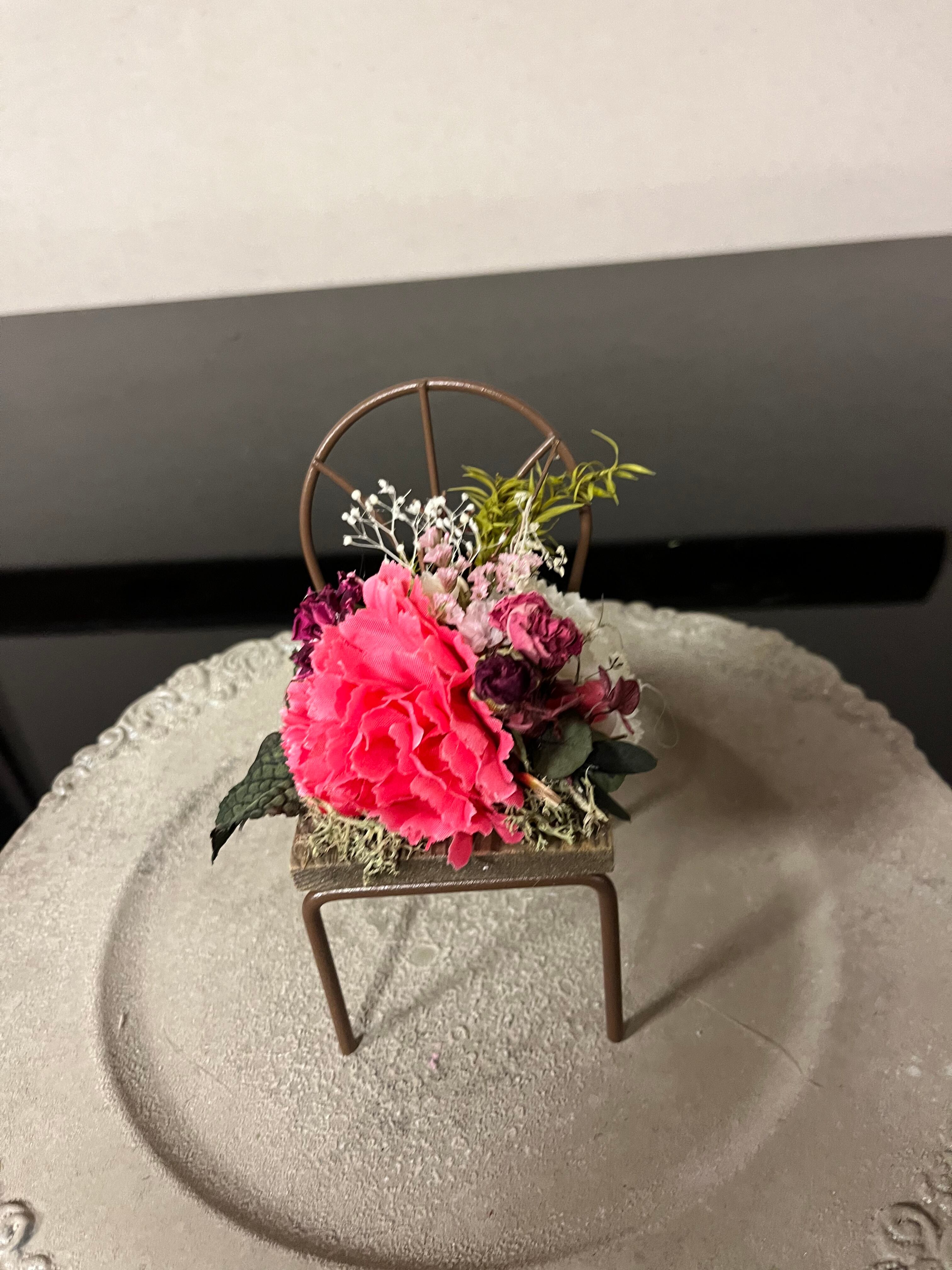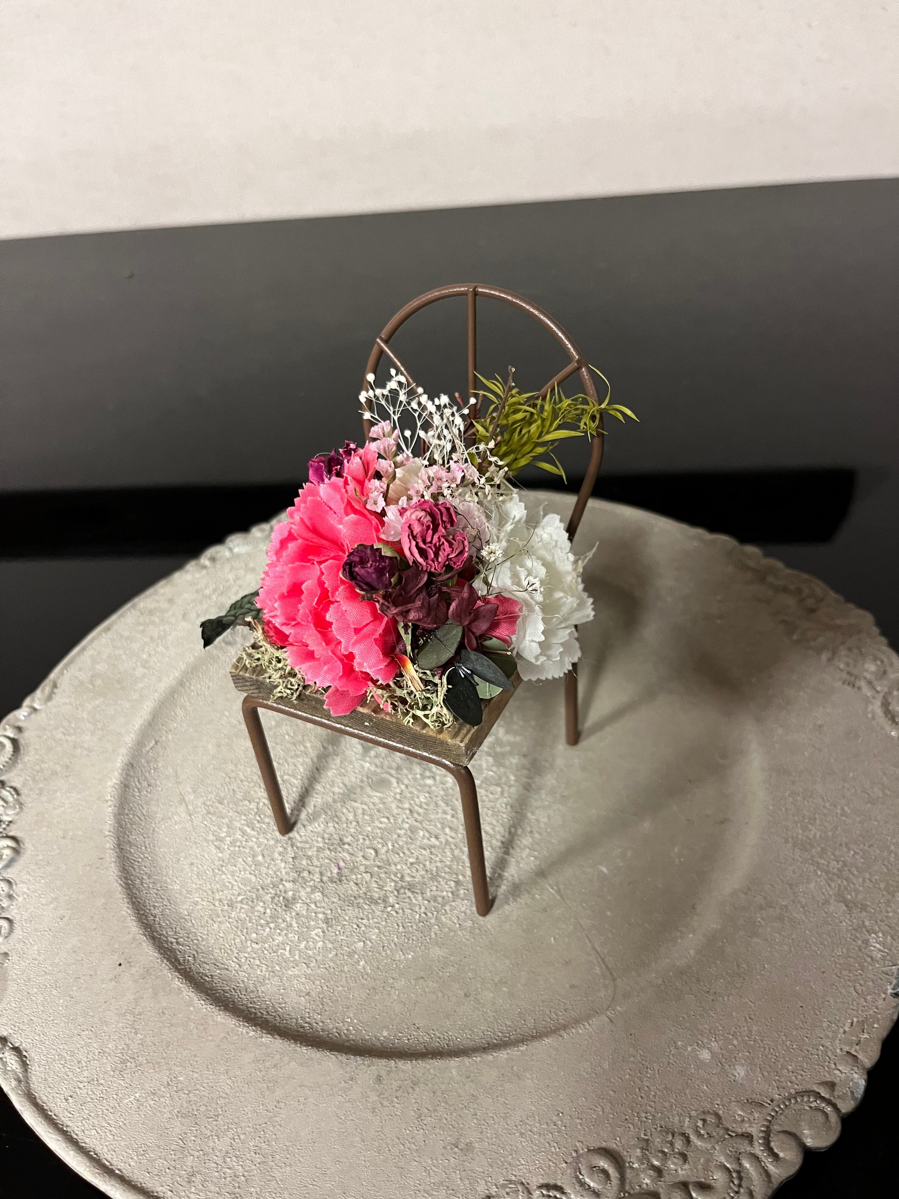 椅子のオブジェにカーネーションなどをアレンジしてみました。