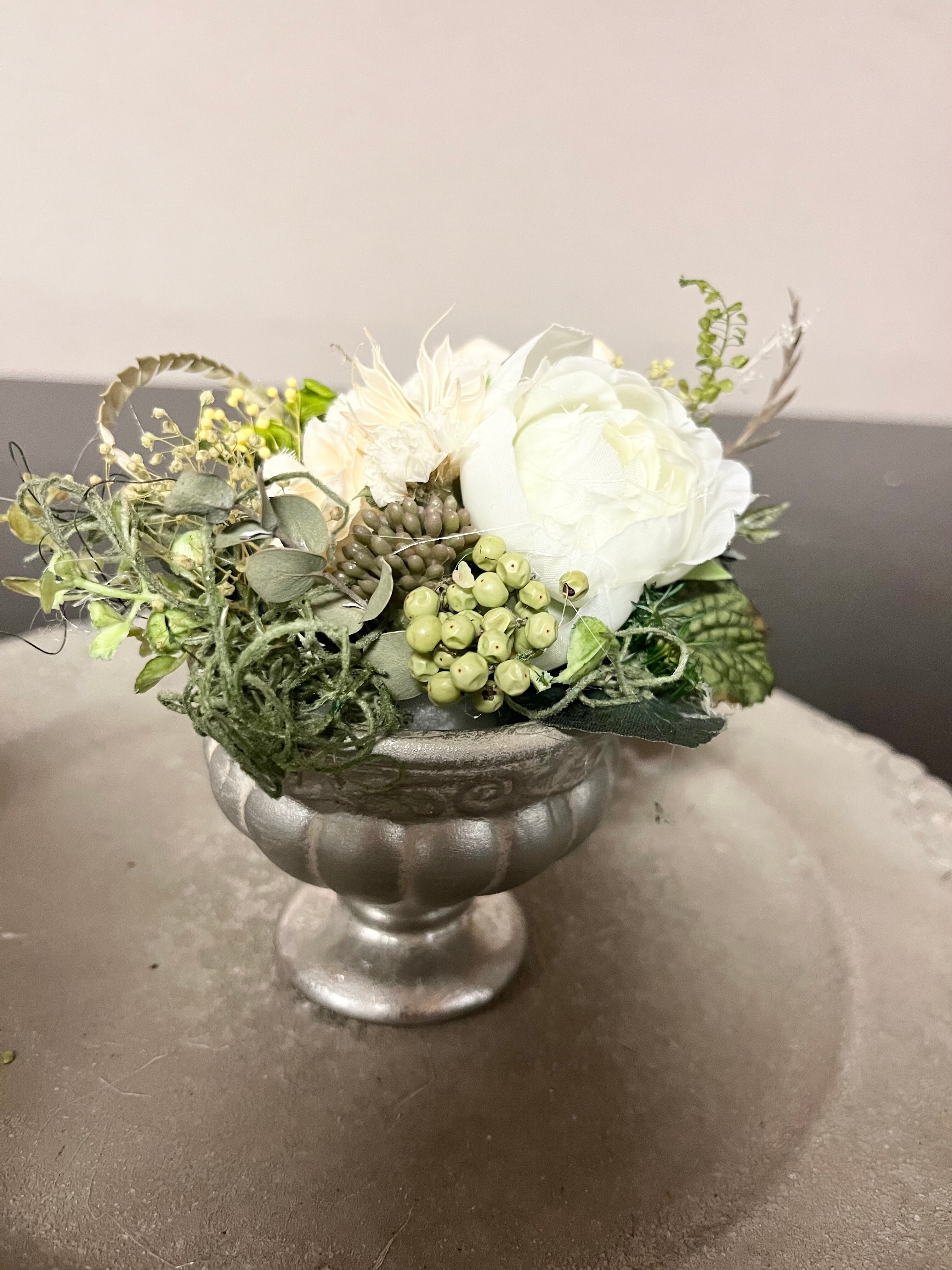 銀色のシックな器にホワイト、グリーンのフラワーアレンジです。