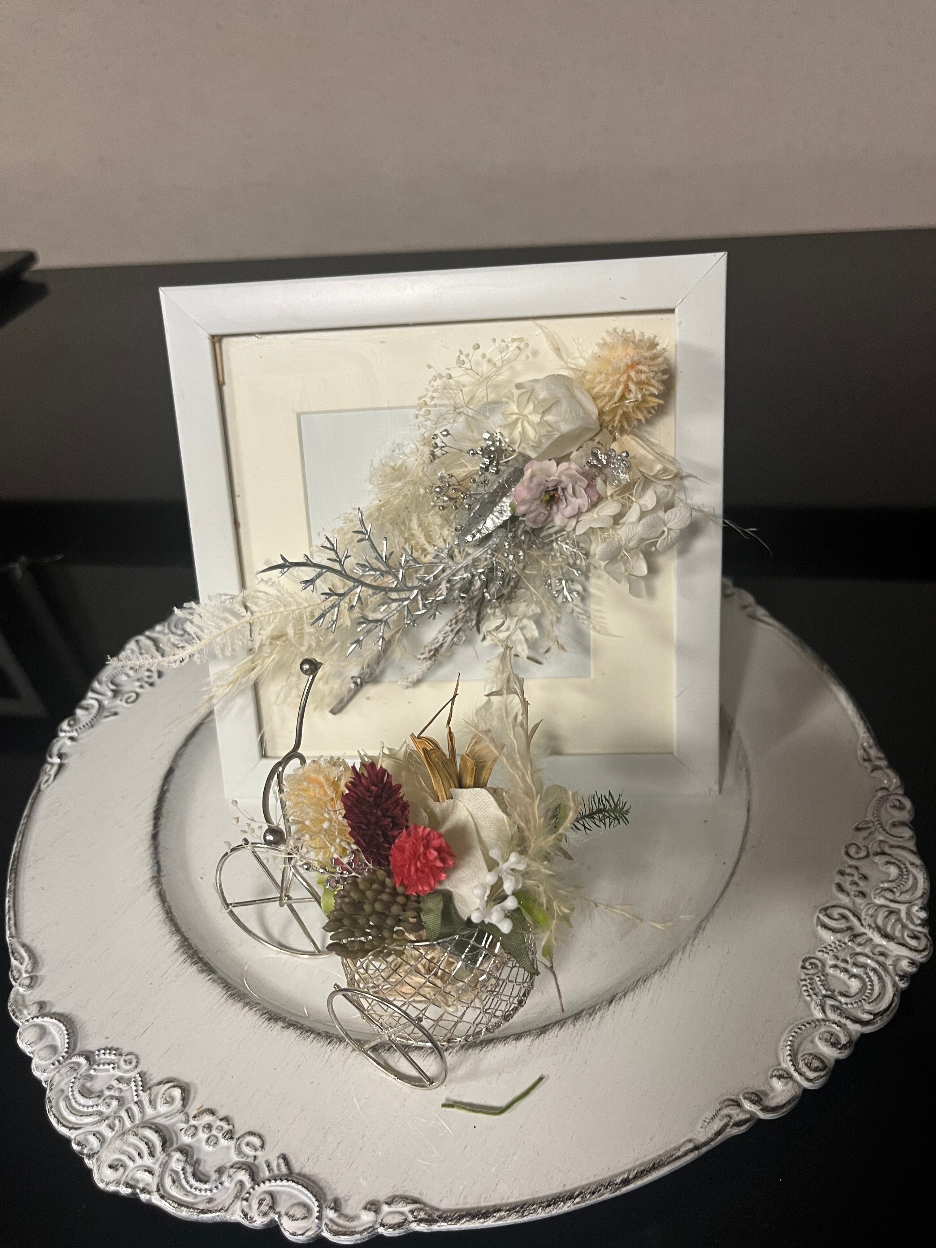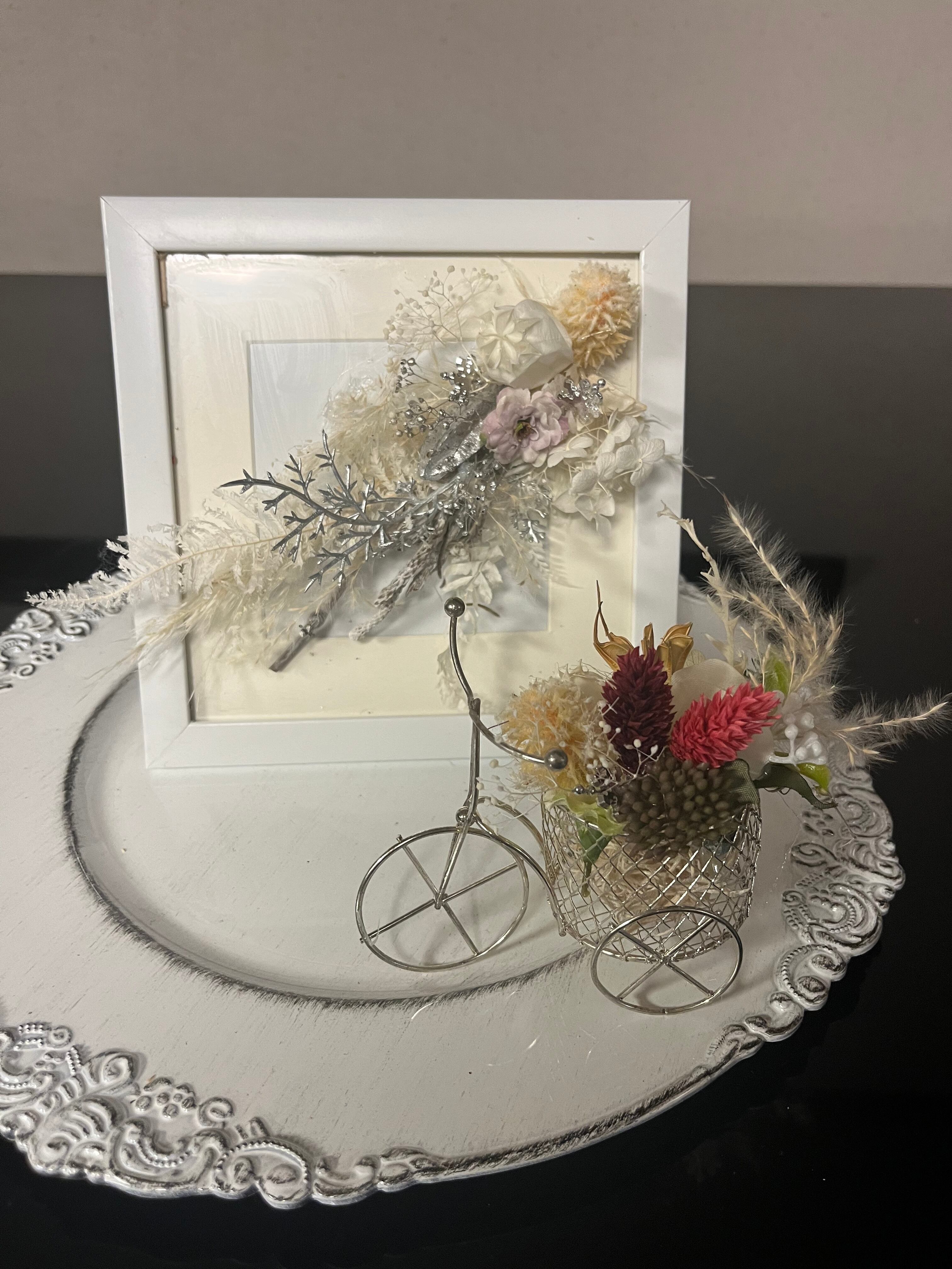 白を基調にした額縁アレンジとシルバーの自転車のセットです。✨