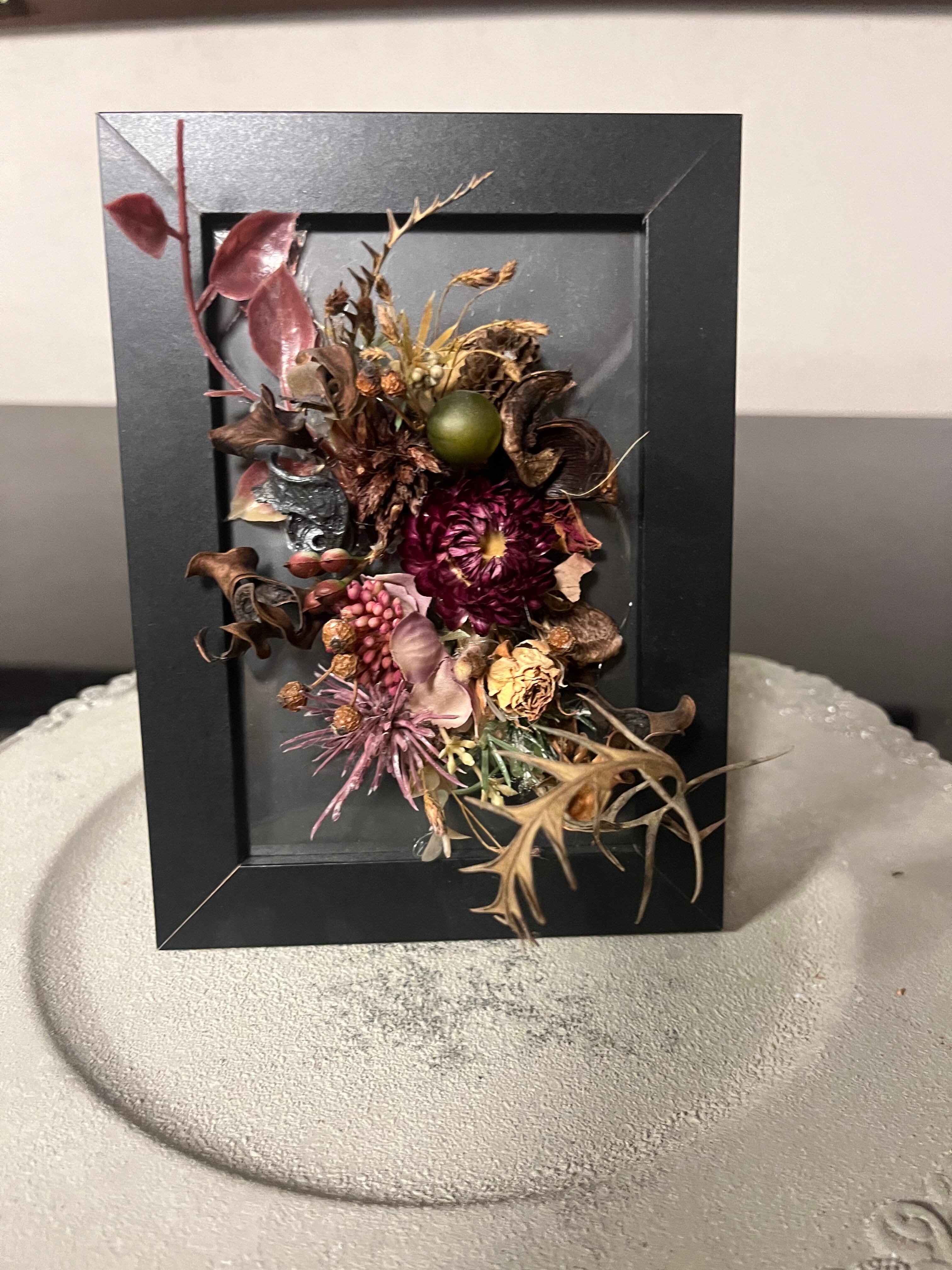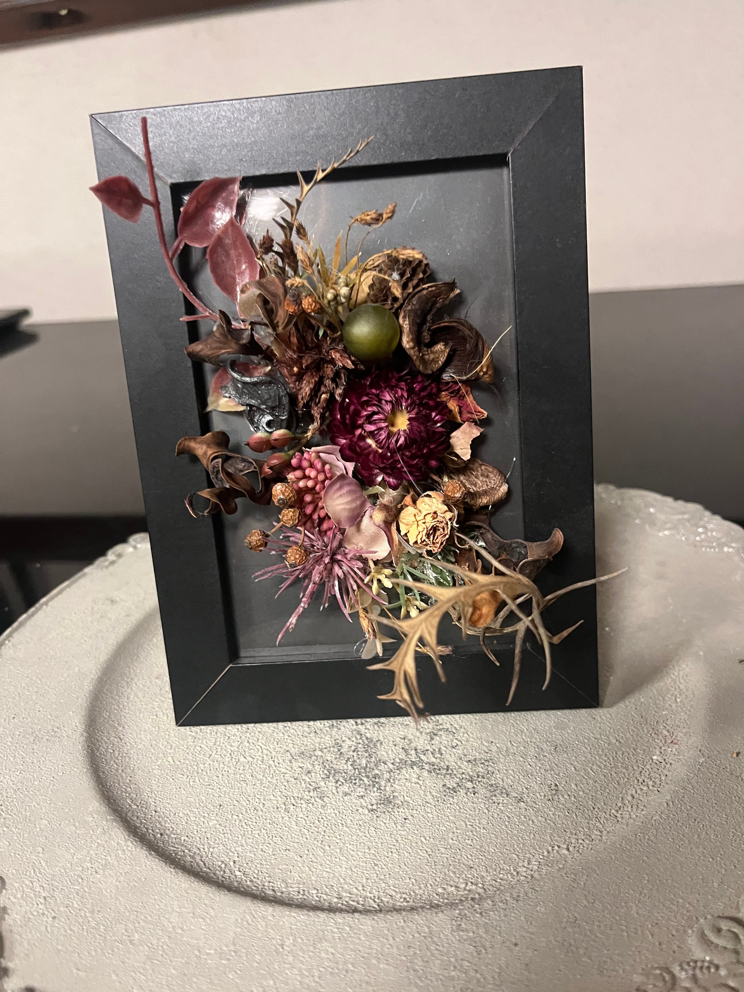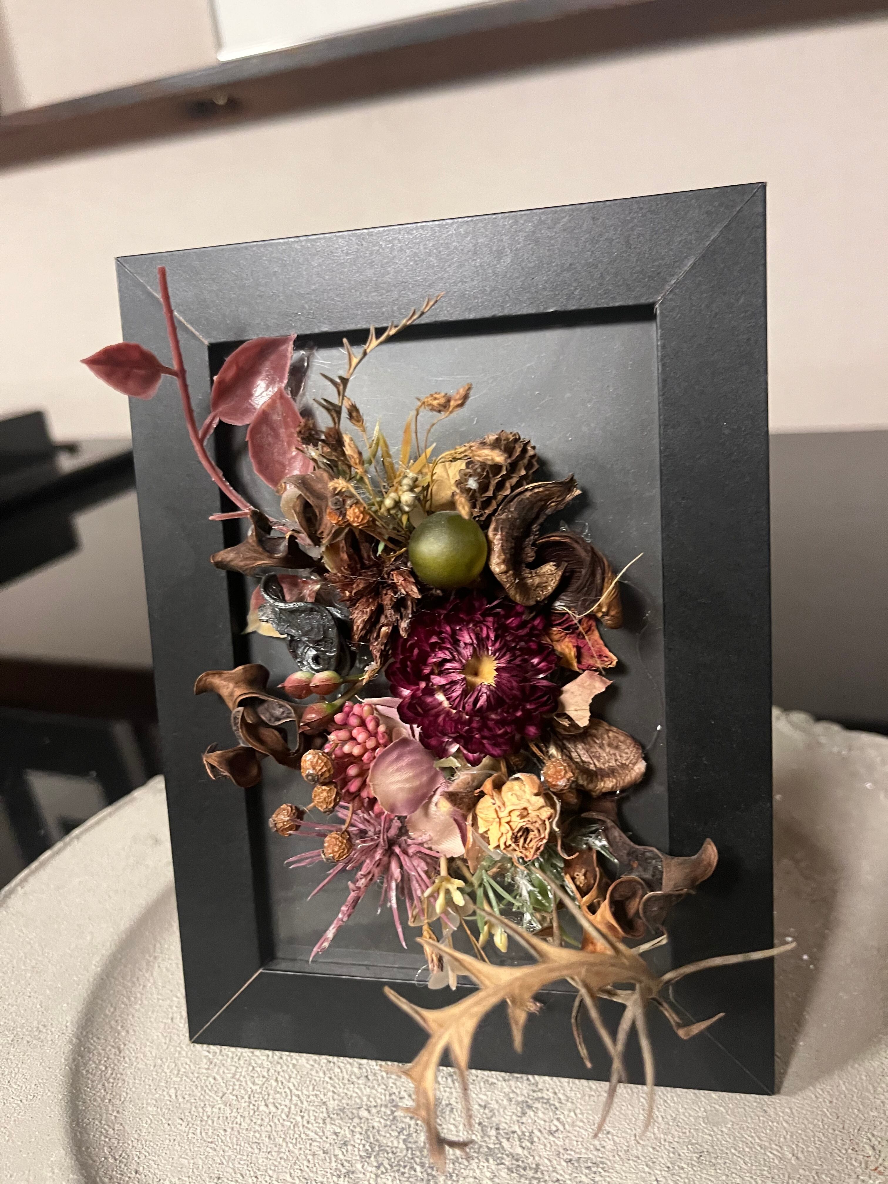黒をベースにしたシックな額縁アレンジです。 モダンなイメージもありつつ、玄関などにこの季節に似合いそうな雰囲気で作成しました。