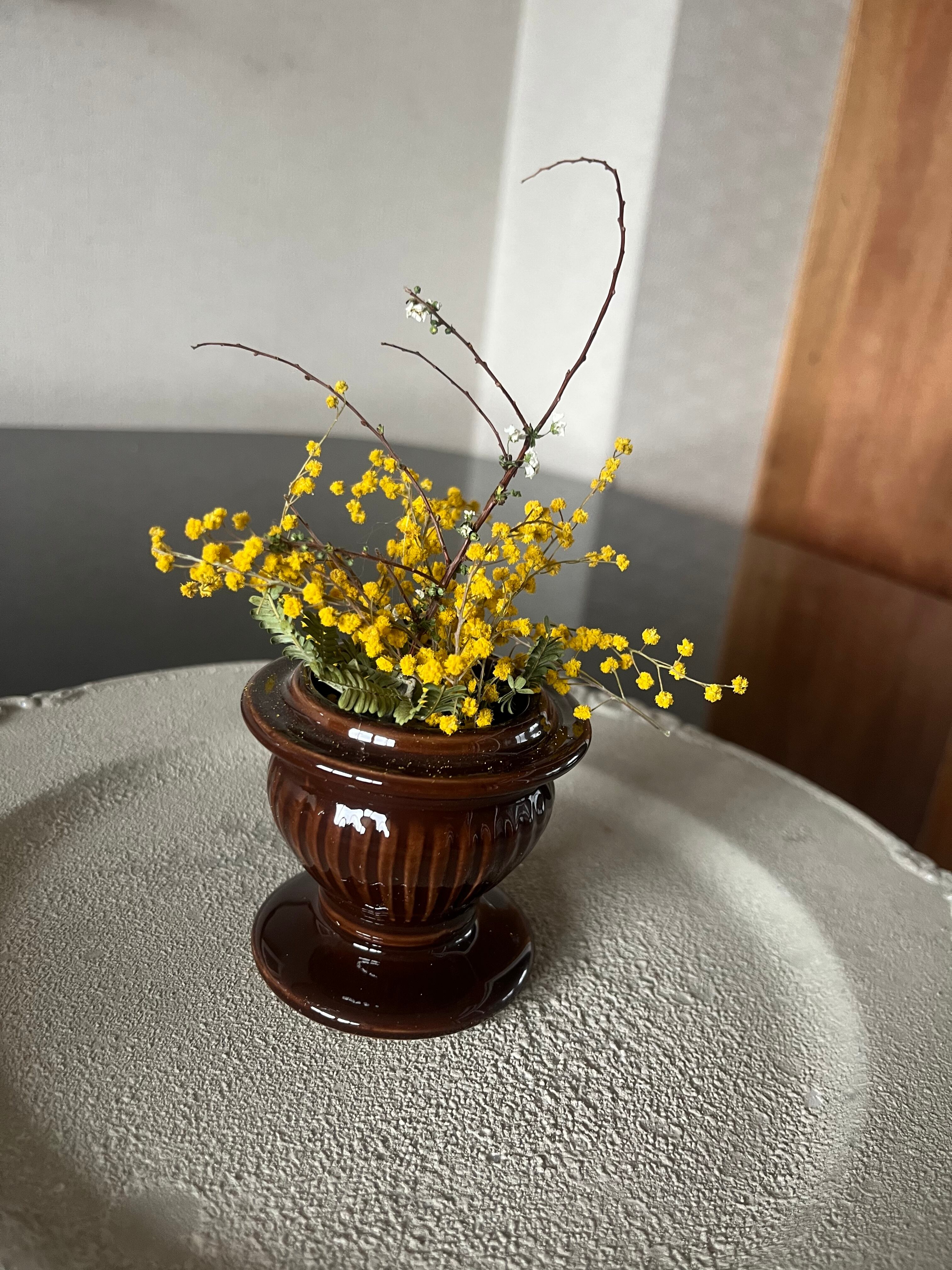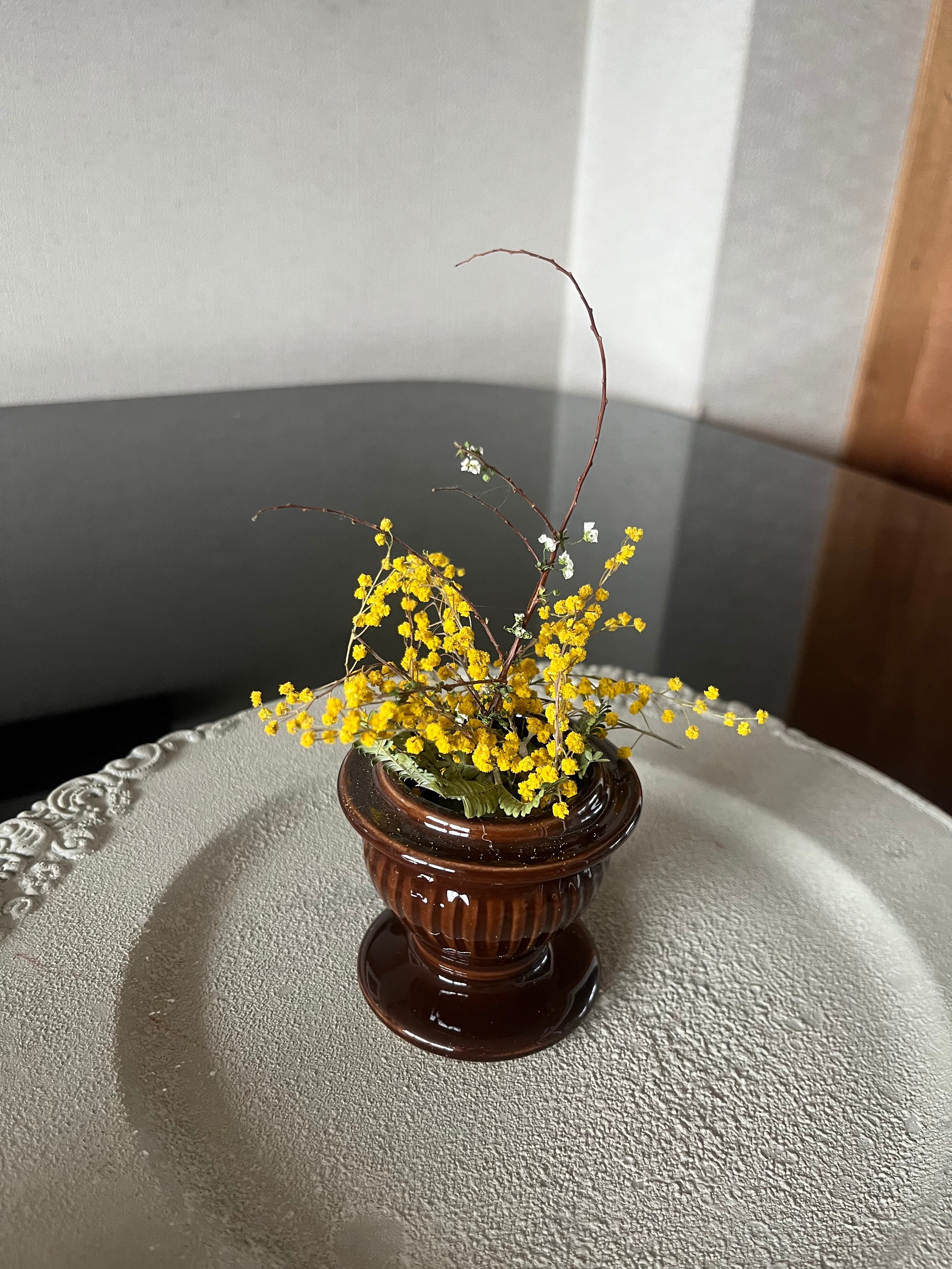 ちょっとお洒落な小瓶にミモザを飾りました。